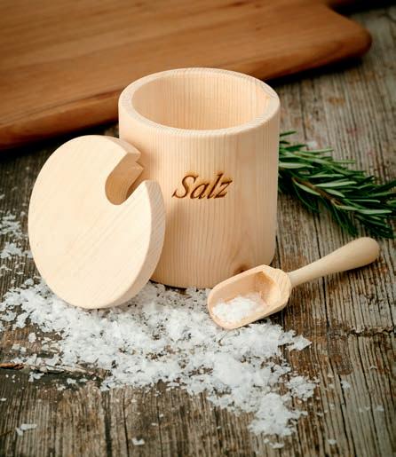 Die handgedrechselte Dose ist ein hübscher und praktischer Aufbewahrungsort für Salz. Der Holzlöffel macht das Dosieren einfach.