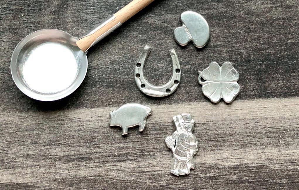 Statt mit Blei werden Figuren mit Bienenwachs gegossen. Inhalt: eelicht, Löffel, 5 Stücke Wachs, eschreibung mit Deutungen. € 25,–