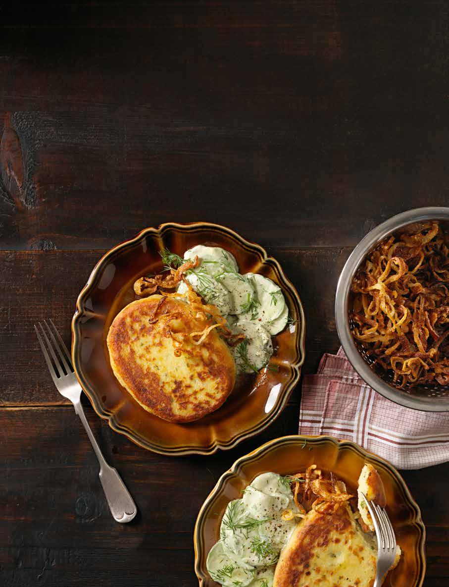 9. Heiß anrichten, Röstzwiebeln auf die Puffer verteilen.