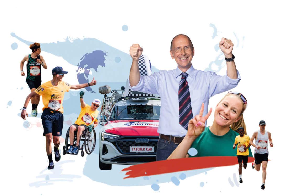 Wie das möglich ist? 30 Minuten nach dem Start nimmt das sogenannte Catcher Car die Verfolgung auf, das im Lauf der Zeit an Geschwindigkeit zunimmt. Wo man eingeholt wird, dort ist die persönliche Ziellinie. Das Auto – ob physisch beim Flagship Run oder vir tuell in der App – startet mit 14 km/h und wird dann schneller. Anfangs steigert es das Tempo um 1 km/h pro 30 Minuten, später sind es 4 km/h. Jeder wird also irgendwann eingeholt. Keiner muss es bis zu einem Punkt X in weiter Ferne schafen, sondern alle laufen, solange es Fitness, Spaß und Ehrgeiz zulassen – bis eben das Catcher Car als Ziellinie zu ihnen kommt.