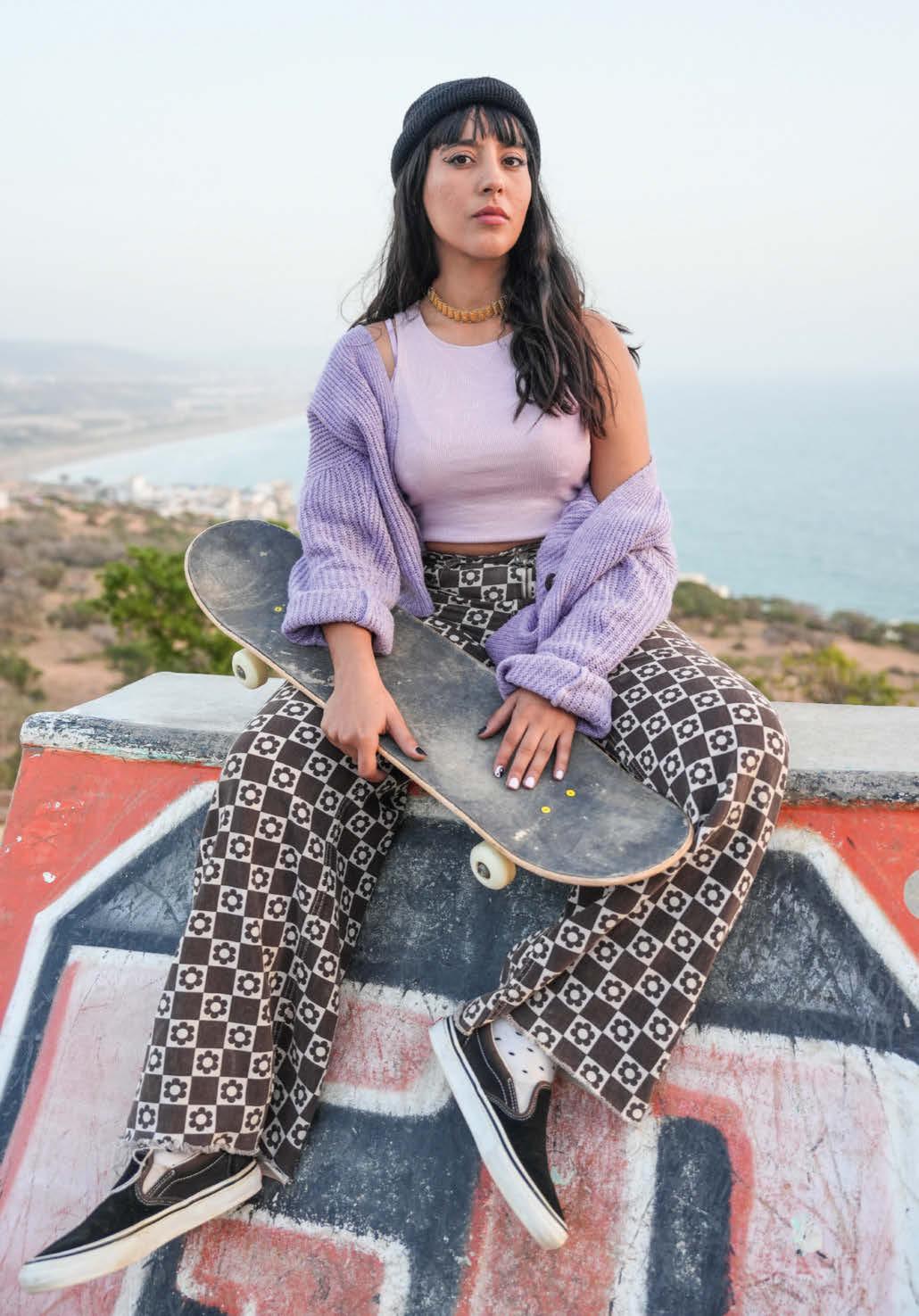 Ici, côté glisse, c’est le surf qui domine… C’est toujours le cas. Quand j’ai commencé, il n’y avait pas d’avenir dans le skate, il était impossible d’en vivre. Quant aux filles, on devait être trois à Agadir, une à Casablanca, une à Rabat peutêtre… Aujourd’hui, on est autour de la trentaine. Mais je suis toujours restée réaliste : le skate a fait de moi ce que je suis, m’a offert tellement d’opportunités… Je ne serai jamais une pro-rideuse, mais peu importe !