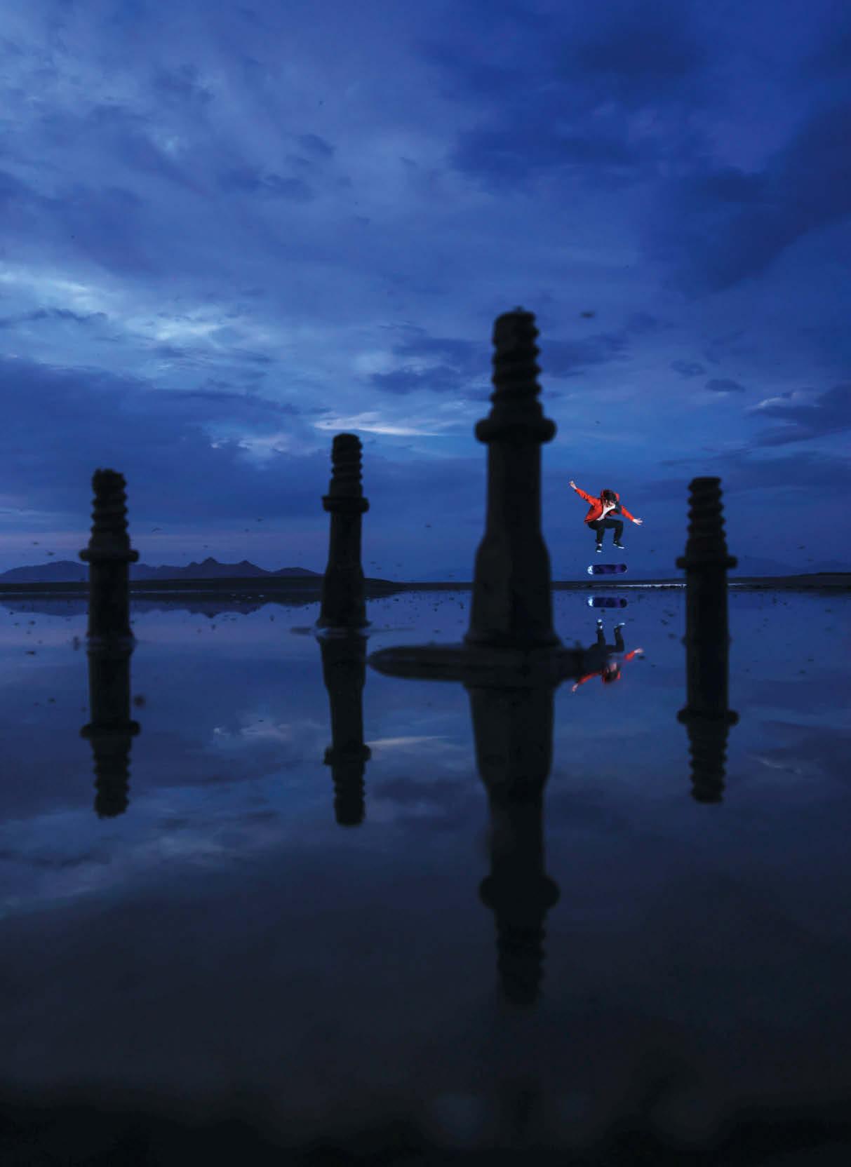 Ce n’est pas tous les jours que l’on assiste à un « kick-flip au Grand Lac Salé », comme l’appelle le photographe Dan Krauss. En fait, vous avez failli ne pas voir celui-ci. Le natif de Salt Lake City préparait des soumissions pour Red Bull Illume quand, dit-il, « j’ai réalisé que j’avais mis au placard une idée que j’avais repérée l’année précédente : un concept d’environnement dystopique surréaliste ». Avec le snowboardeur et skateur Jack Hessler à bord, Krauss a relancé le projet et s’est qualifié pour la demi-finale. dankraussphoto.com ; redbullillume.com