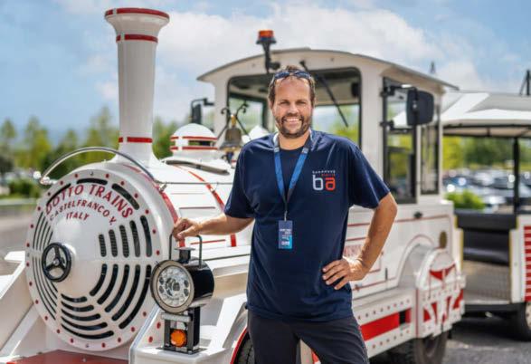 ‘Ik rij al 14 jaar op de trein; we zijn erbij sinds de eerste GP op de nieuwe Red Bull Ring. Een treintje als dit zag ik voor het eerst rijden in een vakantieoord en de Red Bull Ring wilde iets speciaals waarmee toeschouwers over het circuit gereden kunnen worden. Op donderdag maken we ritjes door de pitstraat. En van vrijdag tot en met zondag rijden we van de oost- naar de westzijde met toeschouwers die zich een wandeling willen besparen. Een trein kost wel 150.000 euro en gaat twintig jaar mee. De topsnelheid is 10 km/u, waarvoor een gewoon rijbewijs voldoende is, ondanks de flinke lengte. De wagons bouwen we zelf. Zelf ben ik trouwens een groot Verstappen-fan.’