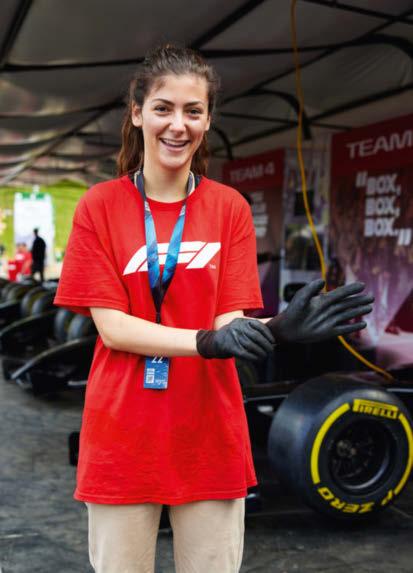 ‘Het pitstop-spel in het fangedeelte van het circuit werkt als volgt: teams van drie personen proberen zo snel als mogelijk de voorband van een F1-wagen te wisselen. Eén is verantwoordelijk voor de oude band, één voor de nieuwe. De derde bedient de hydraulische slagschroevendraaier. Het is mijn taak om het spel te begeleiden: ik leg de regels uit, geef de startvolgorde, maar help ook wel een handje mee. Het spel begint om negen uur ’s ochtends en duurt tot in de avond. Eigenlijk hebben we alleen pauzes tijdens de race en de kwalificaties. Ik ben 21 jaar en heb een jaar in Amerika gewoond. Dit maakt het voor mij gemakkelijk om continu te wisselen tussen Engels en Duits. Mijn acteeropleiding helpt ook. Sommige deelnemers nemen de pitstop-game erg serieus en springen na hun beurt direct naar achteren, net zoals in het echt. De beste tijd tot nu toe: 2,6 seconden, dat is zowat op F1-niveau.’