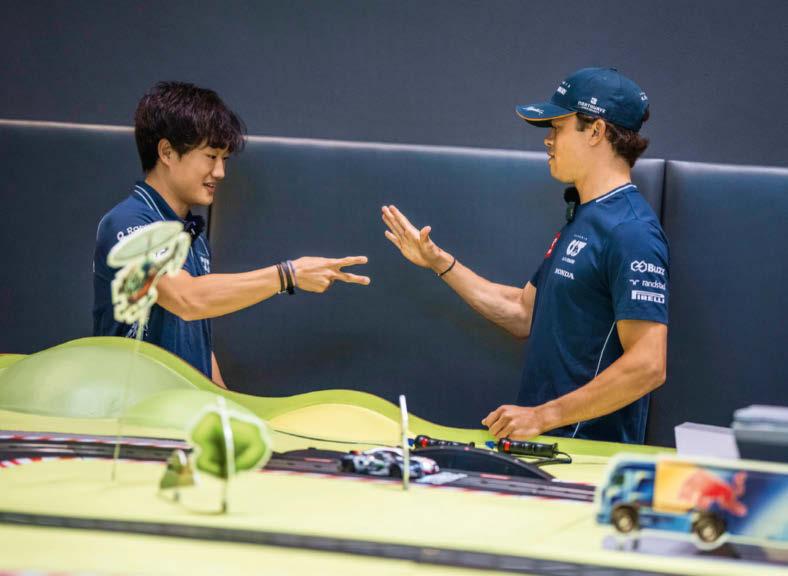 Paper, scissors, stone: Yuki Tsunoda en Nyck de Vries bepalen de startopstelling voor een race op het minuscule Carrera-circuit.