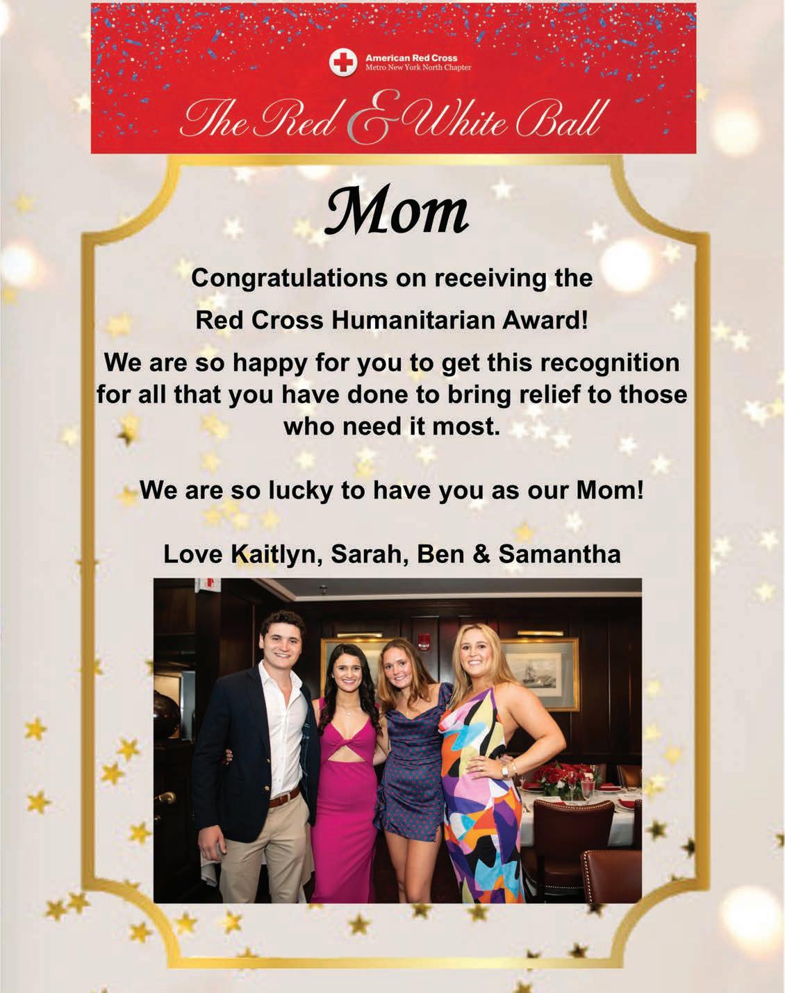 On behalf of the Board of Directors, volunteers, and staff of the American Red Cross Metro New York North Chapter, it is our honor and pleasure to welcome you to our 2024 Red & White Ball: A Salute to Service and Valor. We extend a warm and heartfelt thank you to our Ball Co-Chairs, Connie Anne Harris and Lauren E. Walsh, who, along with the entire Ball committee, made this night possible.