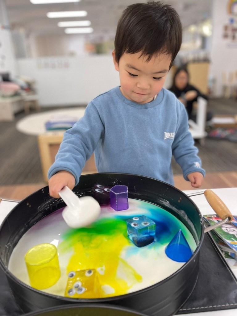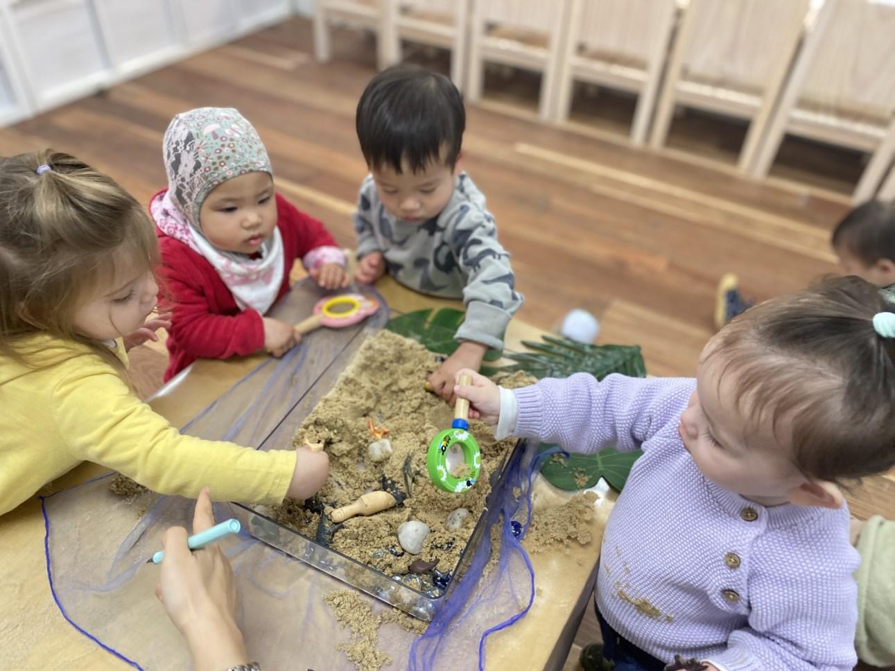 We have started our look into the Wide World of Animals with Dinosaurs and Extinct Animals as the children’s interest is always peaked when Dinosaur’s are around. The children have engaged in various sensory play activities such as small dinosaur world play where there were dinosaur figurines, sand and a cup filled with baking soda. This represented an imaginary scene in the of dinosaurs living around an active volcano. The children were offered a dropper and a glass of vinegar to experiment the chemical reaction between baking soda and vinegar. It also provided an opportunity for them to practise their fine motor skills as well as experiment the concept of cause and effect. Another of our sensory activities continued to allow the children to have adventures in the dinosaur world, and use their imagination to explore ideas related to dinosaurs that lived on this earth millions of years ago. The children were enticed to explore the sensory table of sand, rocks, blue stones and water. They were able to use the small shovels and dig in the sand to uncover the hidden dinosaurs just like an archaeologist would. We also gave the children the opportunity to rescue some dinosaurs from a frozen scene, our little ones just adore finding hidden treasures.