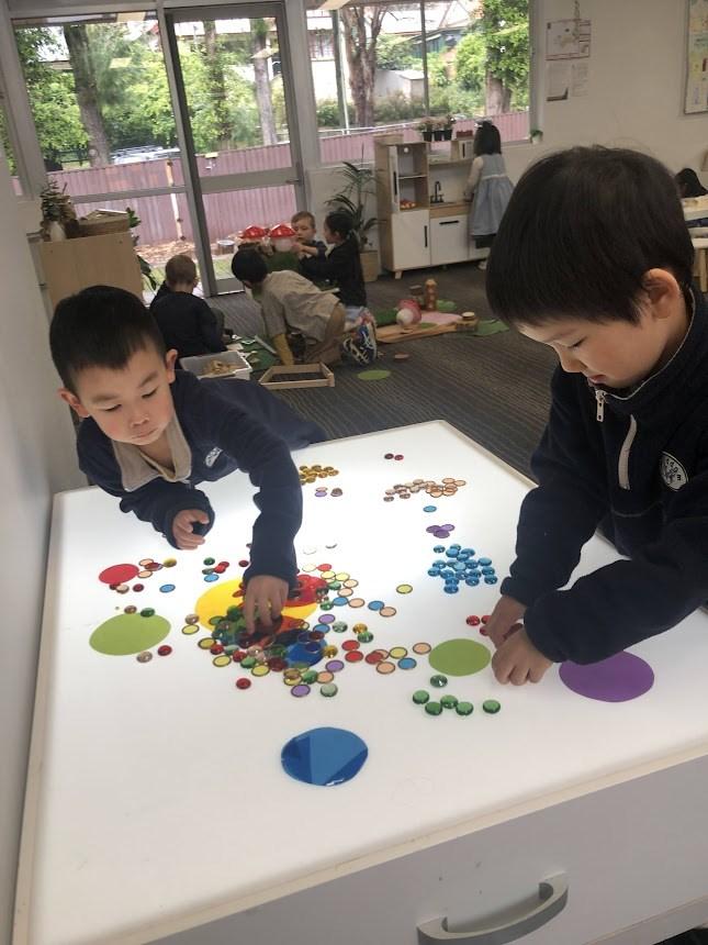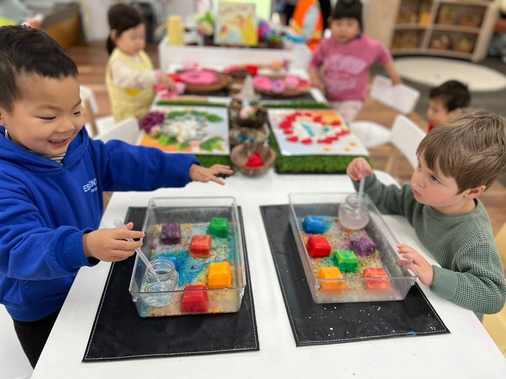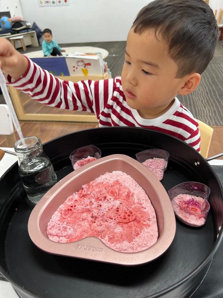 On the provocation table, getting to know 2E children and what they love, all activities were designed and based on the children’s interests to heighten children’s engagement and excitement. Joining in a STEM experience with scented bi carb soda ice cream and vinegar was the most attractive activity of the week. When we dropped vinegar on top of each ice cream, the chemical reaction made a fizzy sound and the pleasant aromas from lemon, strawberry, peppermint and bubblegum. 2E children were also invited to use loose parts to trace and match the colours with the rainbow and love hearts.