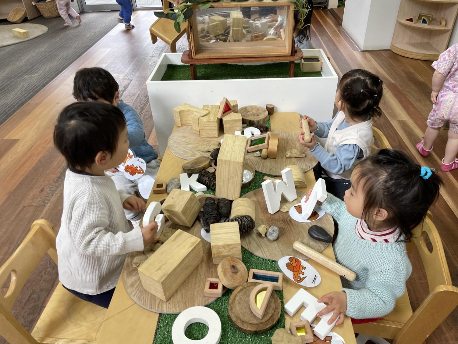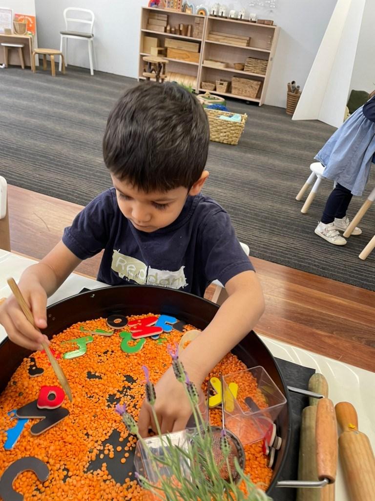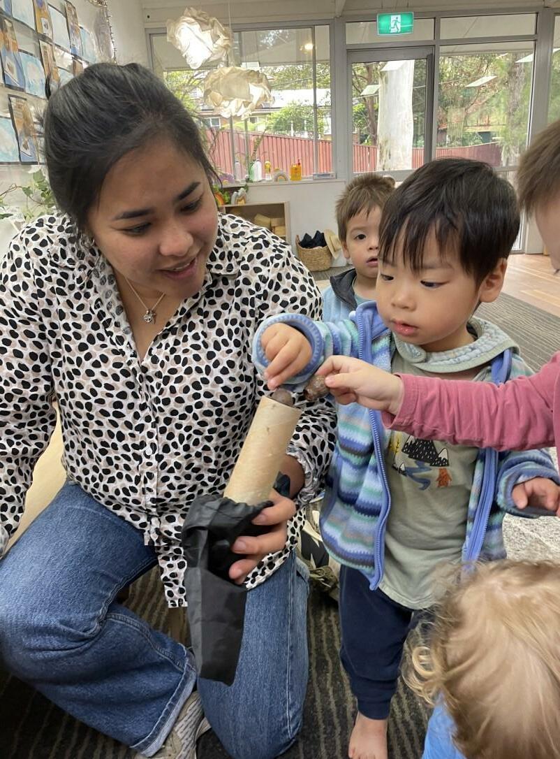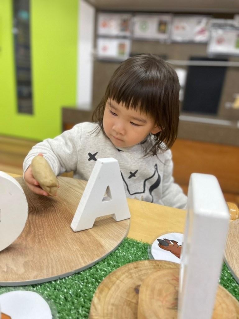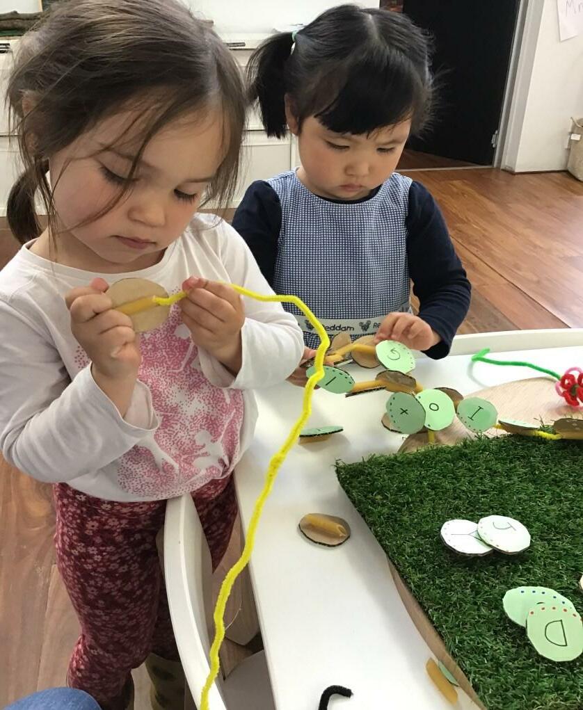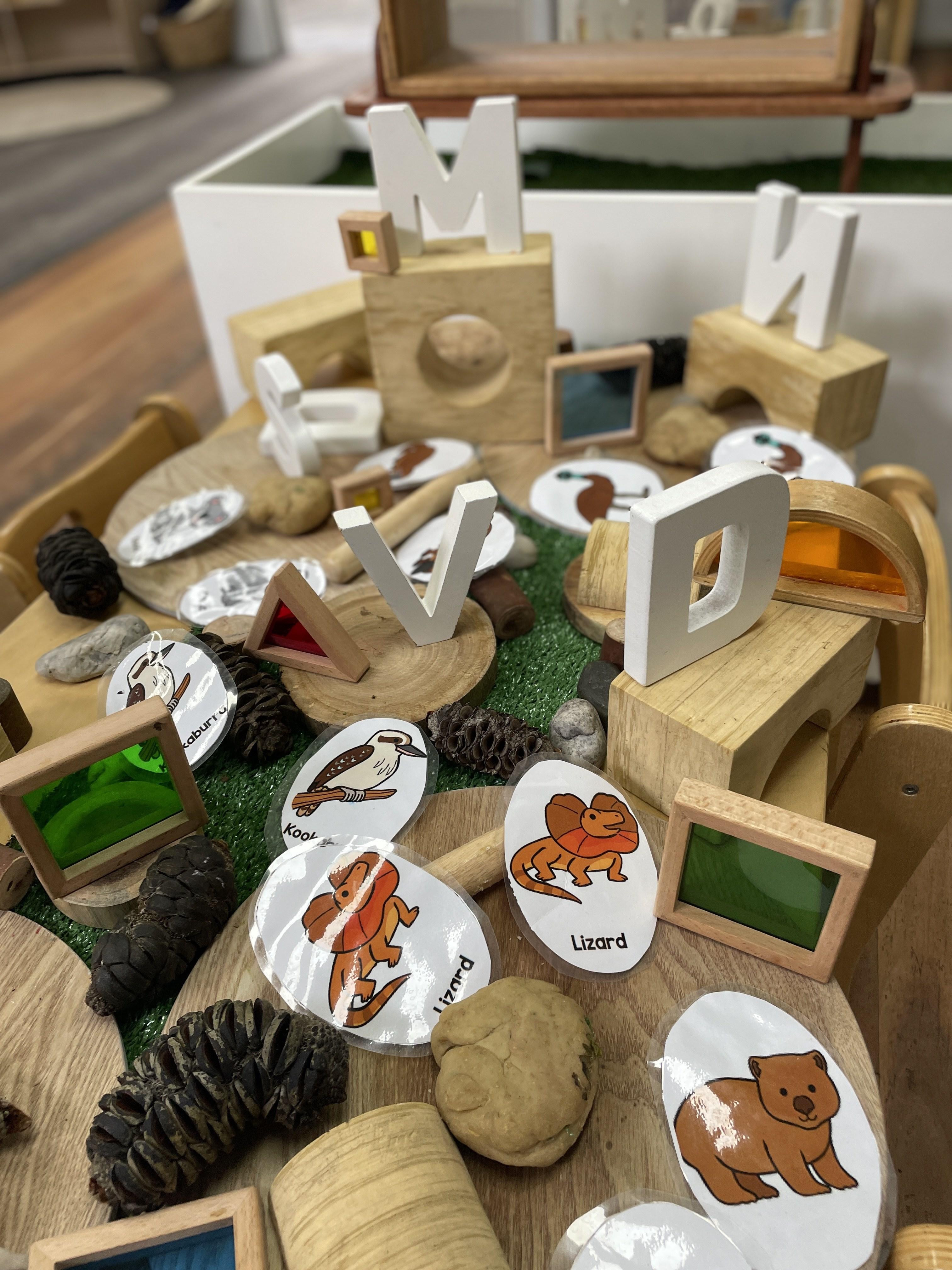 • Engaging with various loose part materials to identify various letters and their corresponding sounds.