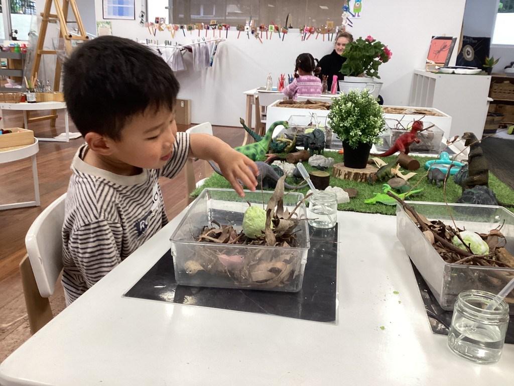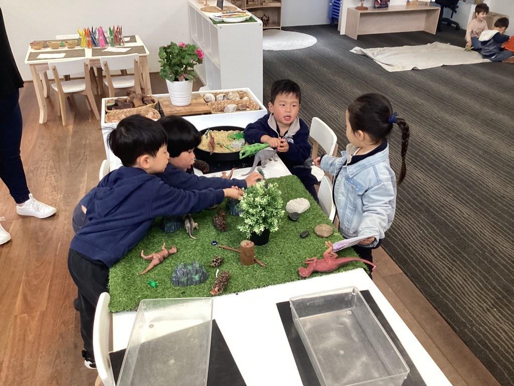 Miss Grace and Mr Bayden the dinosaur small world to identify different types of dinosaurs and consolidate information such as bipedal and quadruped dinosaur types.