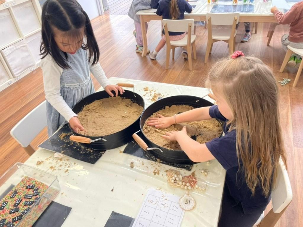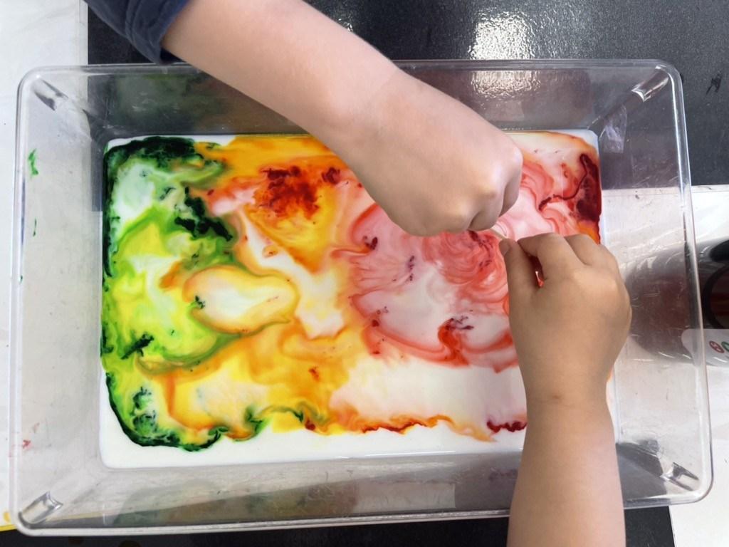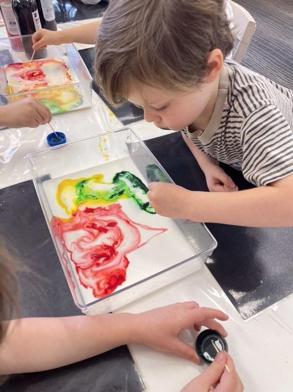 At our sensory and manipulation table, the children enjoyed manipulating sand with a variety of pink loose parts. They poured and scooped the sand, arranged the materials and counted the different items too. More pink sand was included in our Zen trays, with rakes to push the sand around. Wooden letters spelled out LOVE, and stones, flowers and stacking stones were provided to for the children to explore. Pink play dough was popular as the children cut it out using heart shaped cutters and stuck in flowers. In our Atelier, the children created colourful pictures of their choice, illustrating fairy tale characters and including rainbows. The colours continued with our Magic Milk experiment, where the children revisited the concept of surface tension as they dipped toothpicks covered in dish soap into the milk to disperse the colours. Out in our playground, the children also learnt about the importance of teamwork and good sportsmanship, as they participated in a gross motor game called "Pirate Treasure." The children worked together to retrieve their treasure (balls) and also strategised to steal from other pirate chests too.