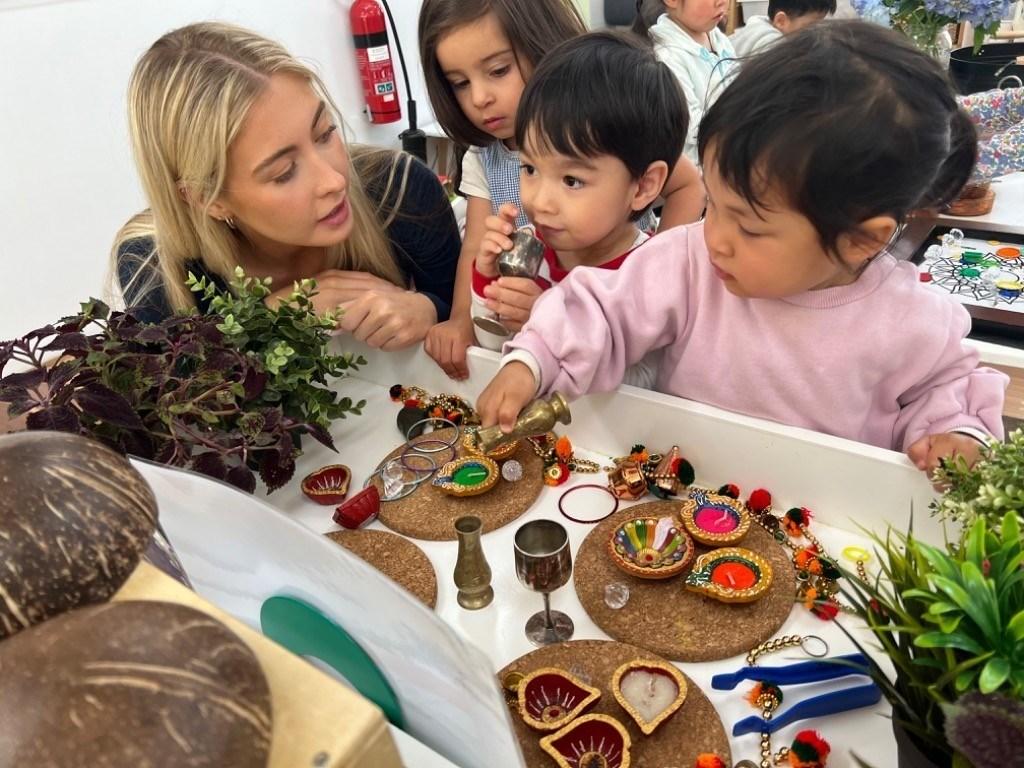 Inspired by Diwali Festival, 2R to the sensory creative experience, our teacher prepared a display of flowers, lentil seeds, beans, spice (cinnamon and star anise), and play dough. Here, the children were invited to create their interpretation of an Indian pattern art called ‘Rangoli Art’. This art is usually made during the Diwali festival and other Hindu festivals. It has been observed that our children were enthusiastic about exploring the variety of textures, colors, and smells of the display. They were focused on cutting, rolling, and transferring the items from one container to another enhancing strength in their fine motor development and visual perceptual motor skills.