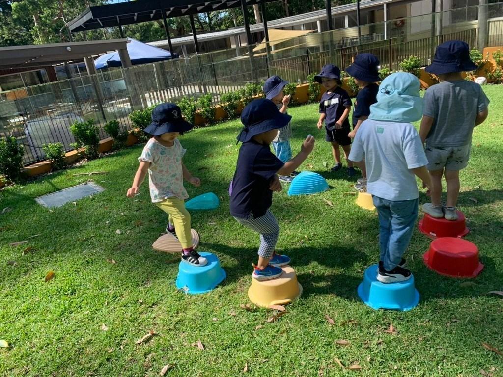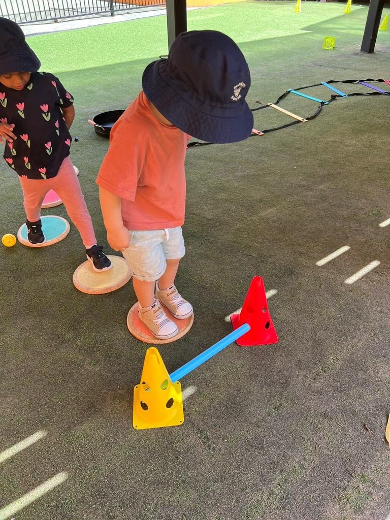 On a rainy day, Miss Chloe invited the children to stretch their bodies through the obstacle games. When the children encountered outdoor obstacle courses, they developed and enhanced strength and balance. In this small group, the children's interest in the obstacle games and their enthusiasm for the challenge was clearly observed. They beautifully took turns and waited for their friends to complete. Most of the children demonstrated concentration and patience to complete the tasks.
