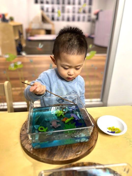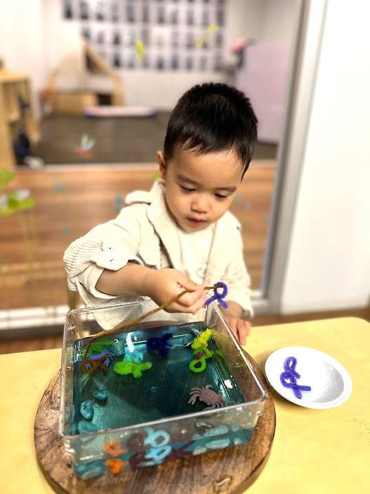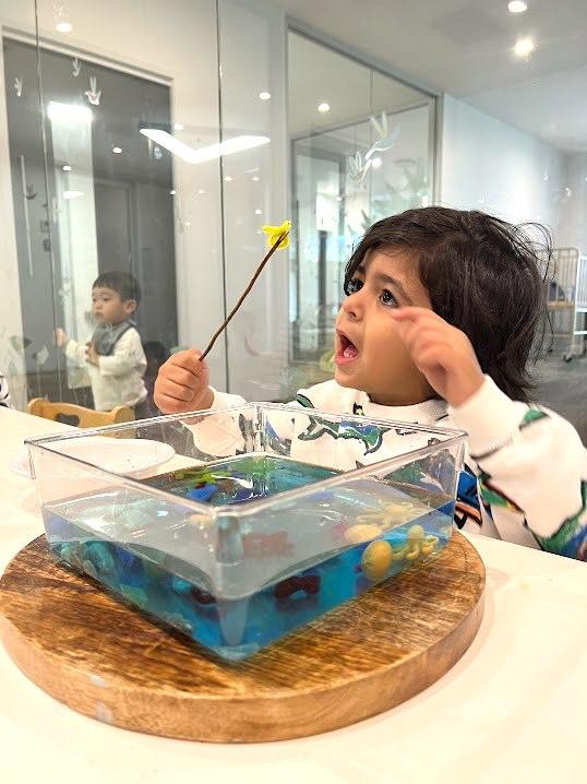 To connect this to our programme we devised a fishing activity, where they found pipe cleaner fish swimming in tubs of water, along with a range of aquatic decorations. The children were given long, thin sticks are their fishing rods, and were challenged to hook the fish onto the rods and lift them out of the water. To complete the task they needed to focus on how they held the rods by refining their pincer grip, and utilise their hand-eye-coordination and concentration as they stuck the rods through the tiny loops on the fish. Once they got the hang of it we extended the challenge by asking them to catch a certain colour of fish, without accidentally moving the other colours, or catching as many fish as they could on their sticks without having any fall off!