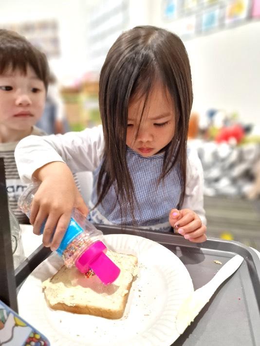 Children could also practice their fine motor skills making our yummy fairy bread. They used a plastic knife to spread the butter and after they put some edible sprinkles. Needless to say they loved the final result!!!