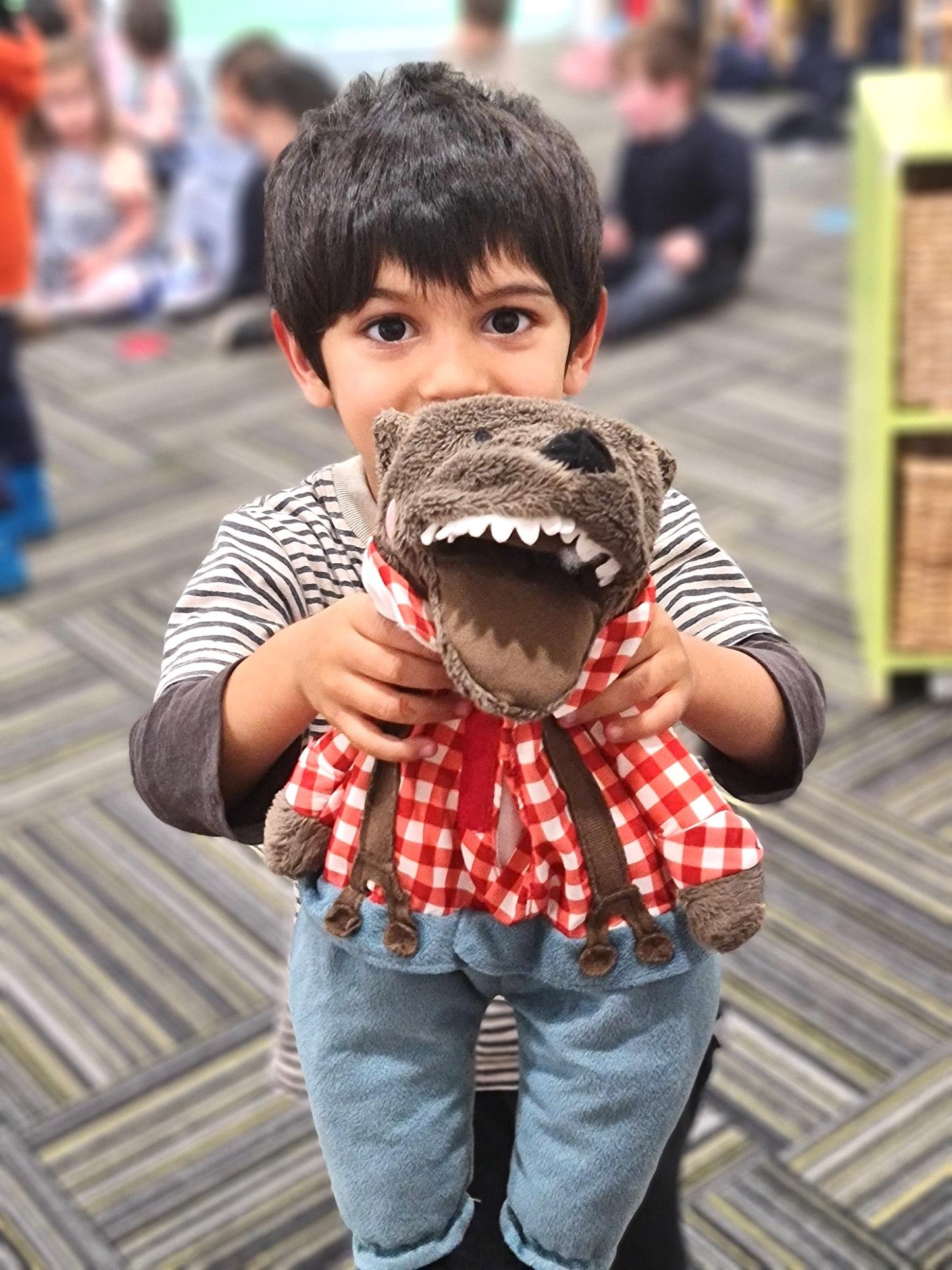 We all then went in the forest, and we had to imagine the sounds they might hear? I asked the children what we would find in a forest. Xavier Z said tress and showed us what sound they make in the wind. Risa became the pebbly road. We also had snakes, rocks, owls, and bushes. We then continued to tell the story Jakey had a turn being the wolf and Charlie and Lucy had a turn being the grandma who hid and then had their own secret plan. Mark showed us his scary wolf teeth. We all changed the ending and different classes came up with their own ending.