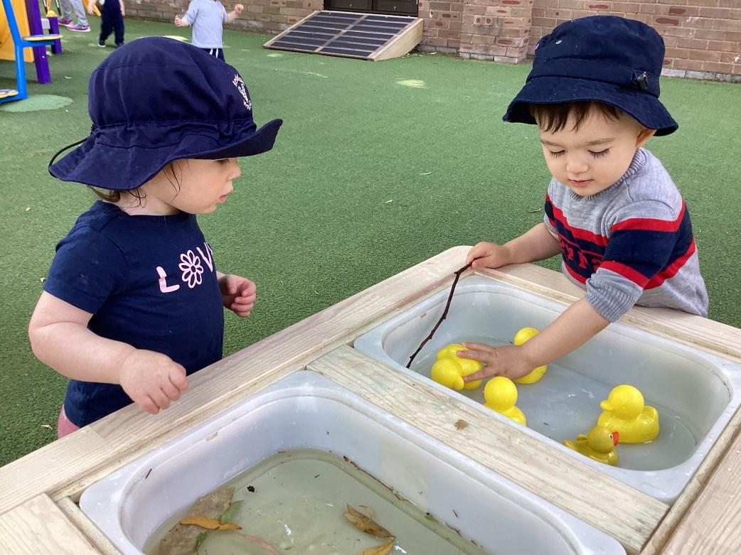 The weather was glorious this week and the children relished their time outdoors, while they took part in a range of experiences. The sensory tubs were placed underneath the tree and filled with water. In one tray there were five ducks, whereas the other was filled with a selection of leaves and sticks. As Sibella and Lilla approached the area, they immediately retrieved a stick and created small splashes by tapping them in the water. In comparison, Ethan used a whisking technique with a stick in the tray containing the ducks, which resulted in a few toppling over due to the motion of the water.