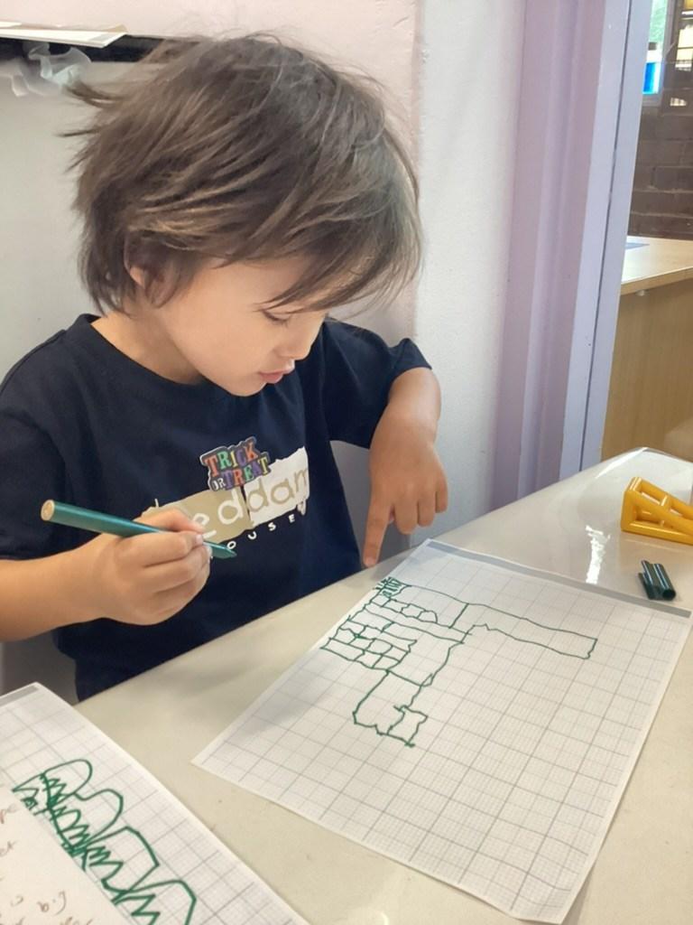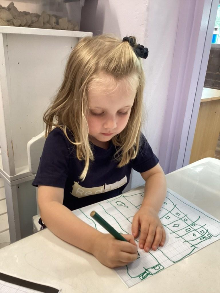 We also started to explore drawing plans for buildings. The art area was set up with blueprint paper and the children went back regularly to design their own buildings. They tried to follow the lines on the blueprint paper and drew shapes including squares, rectangles and triangles. They drew buildings that they know or have seen in real life, as well as thinking of ideas and drawing buildings with elements they imagined.