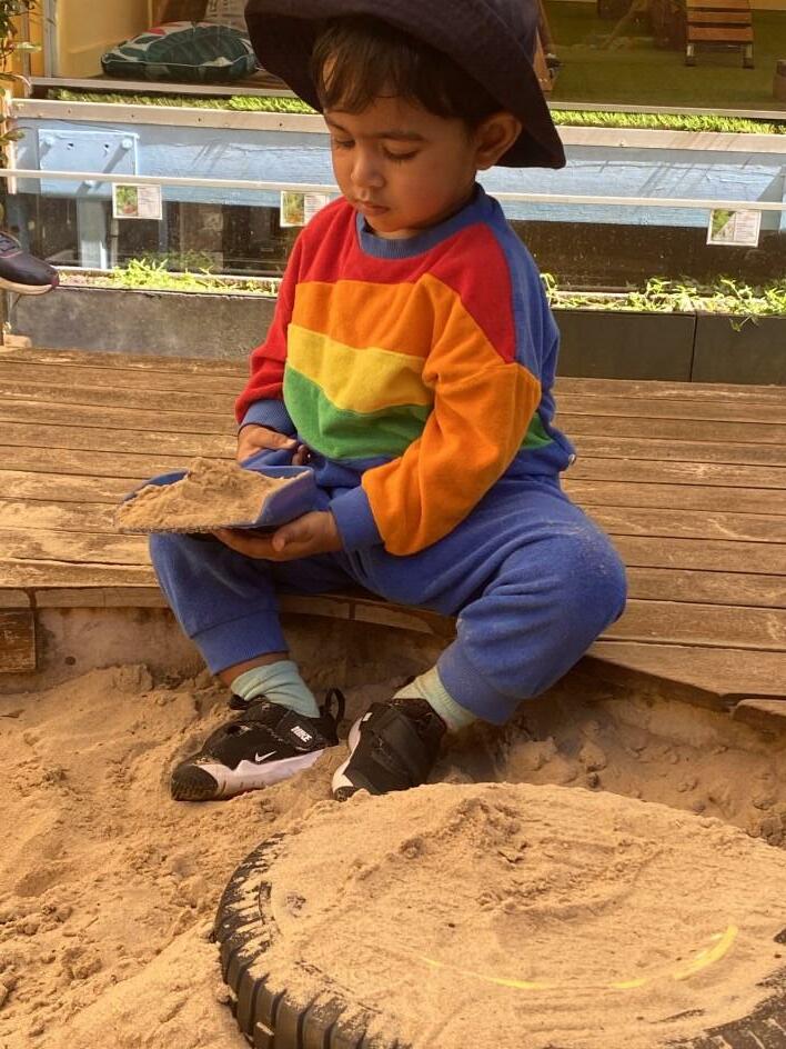 We are nearing the end of the term and the children in the Nest will soon be moving onwards to the following stages which are located upstairs in the ELS. Every day, a few children have taken it in turns to venture up to the deck and spend time exploring their new outdoors surroundings, which include a sandpit, climbing equipment, a kitchen and many more exciting new experiences to investigate. When it was Capri, Krishna, Theodore and Joshua’s turn, they walked up the many stairs independently, with the support of Teacher Fiona and Teacher Robbie, to the outdoor space. Joshua was keen for the gate to be opened quickly, so he could begin his time exploring, whereas Krishna preferred to look around for a few moments before selecting where to play. Placing his finger on his chin, he started to tap it as if he was pondering his options and stating, “Mmmm.” After some time considering he decided to have a turn on the slide.