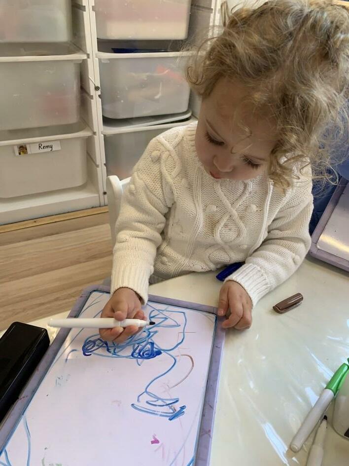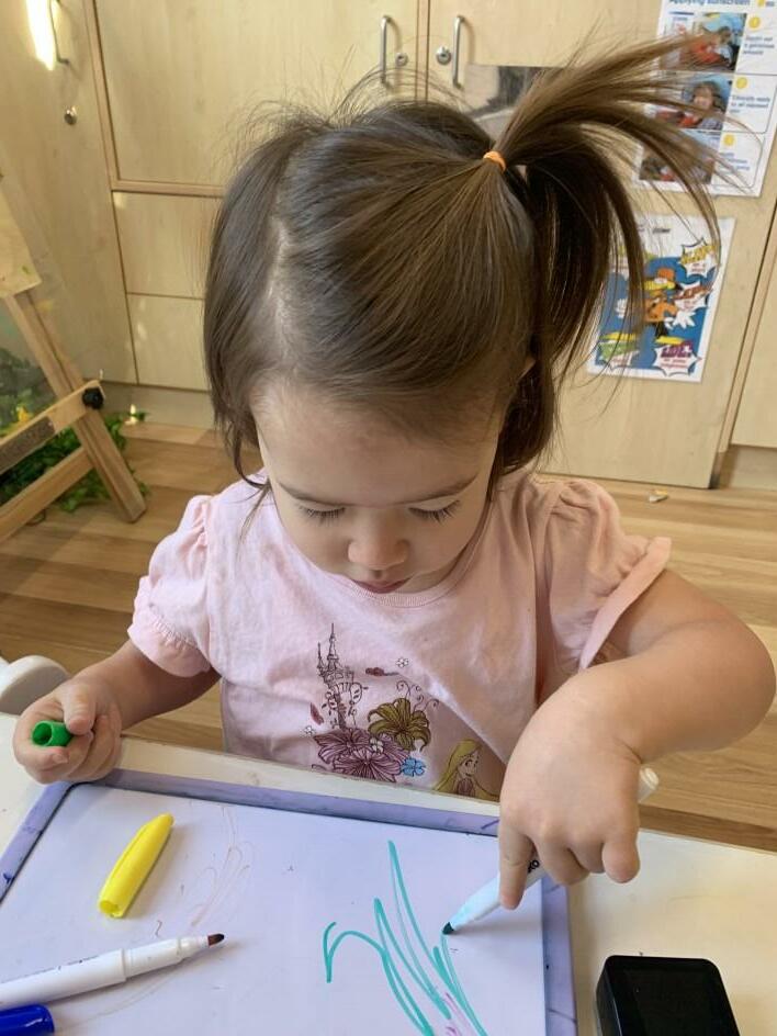 Atelier table, especially when they are creating colourful pictures and they turn their papers the other way to “write” their names independently, chanting the letters they know, not necessary their letters.