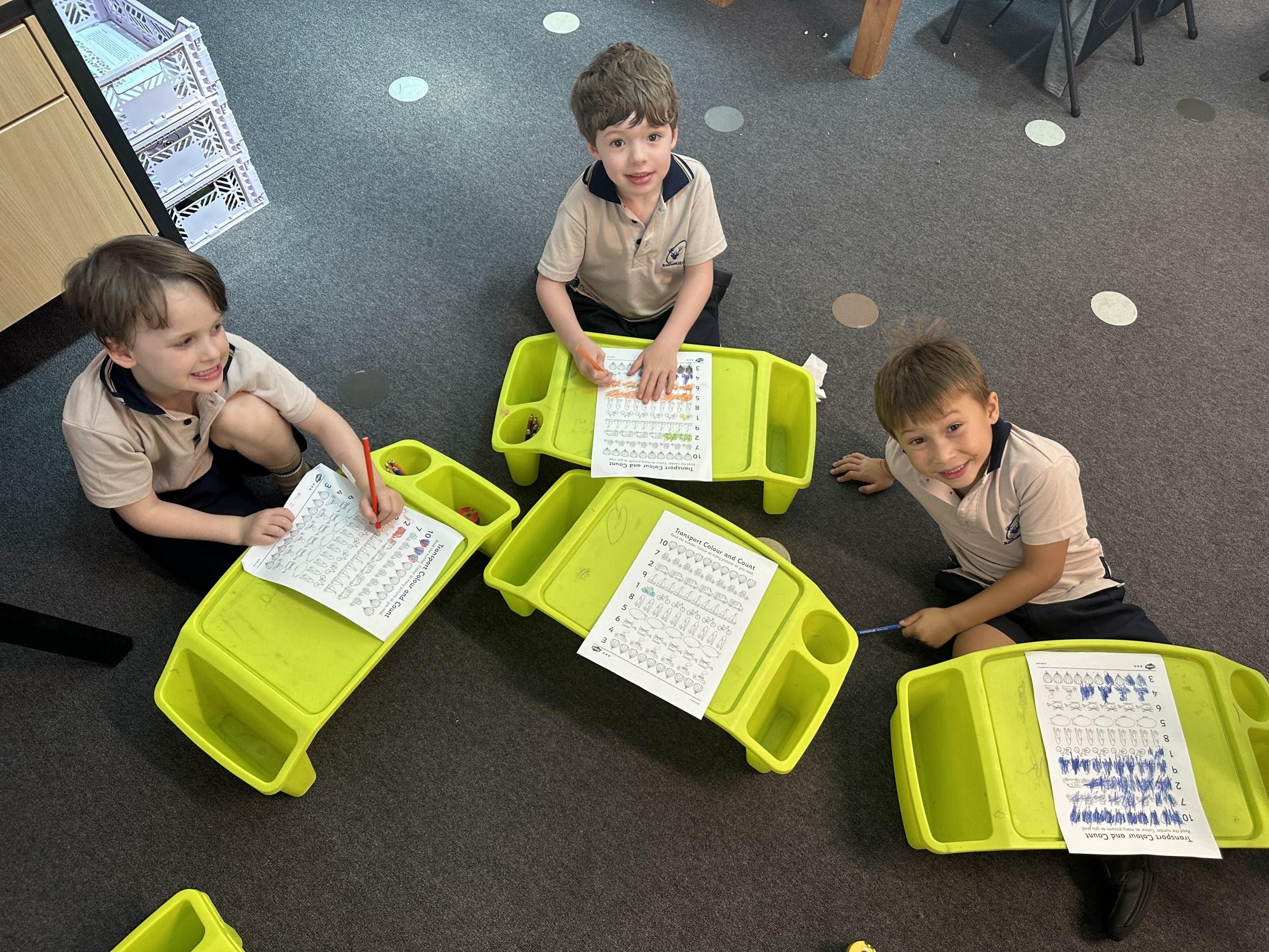 In mathematics we introduced and explored the addition symbol and used language such as put together, add, altogether and total, and the idea of equivalence. We used the ‘+’ and ‘=’ symbols to write calculations, to understand written problems that use these symbols and terminology. We also explored number bonds using hands-on materials. Working in small groups helps to deepen our understanding of the concepts.