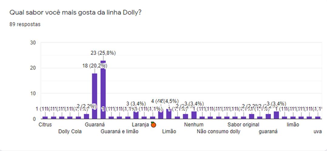 Entre os entrevistados, 74,2% costumam consumir a marca Dolly e 25,8% revelam que não consomem. Dentre os consumidores do nosso cliente, 41 entrevistados representando (46%) gostam do sabor Guaraná.