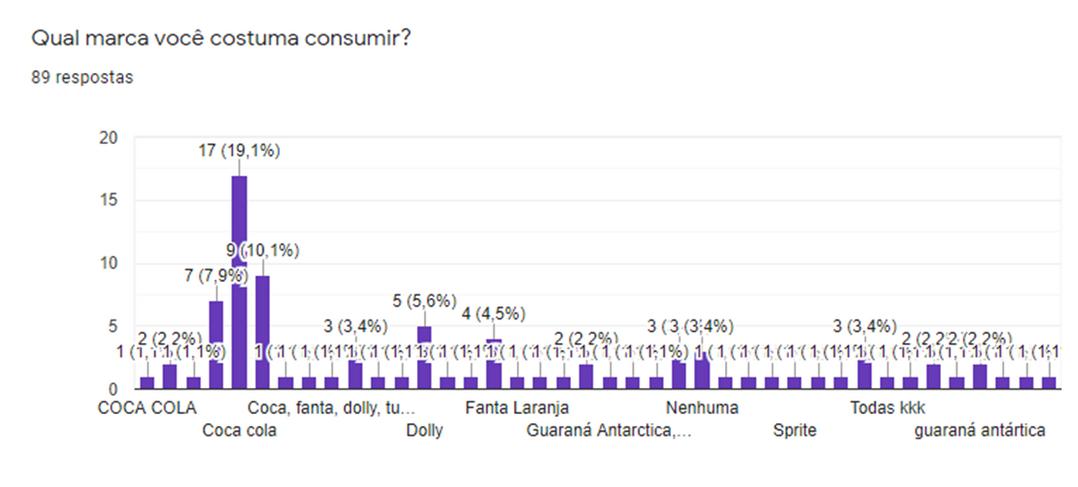 79,8% dos entrevistados consomem refrigerante, dentre eles 17 (19,1% revela consumir somente Coca-Cola).