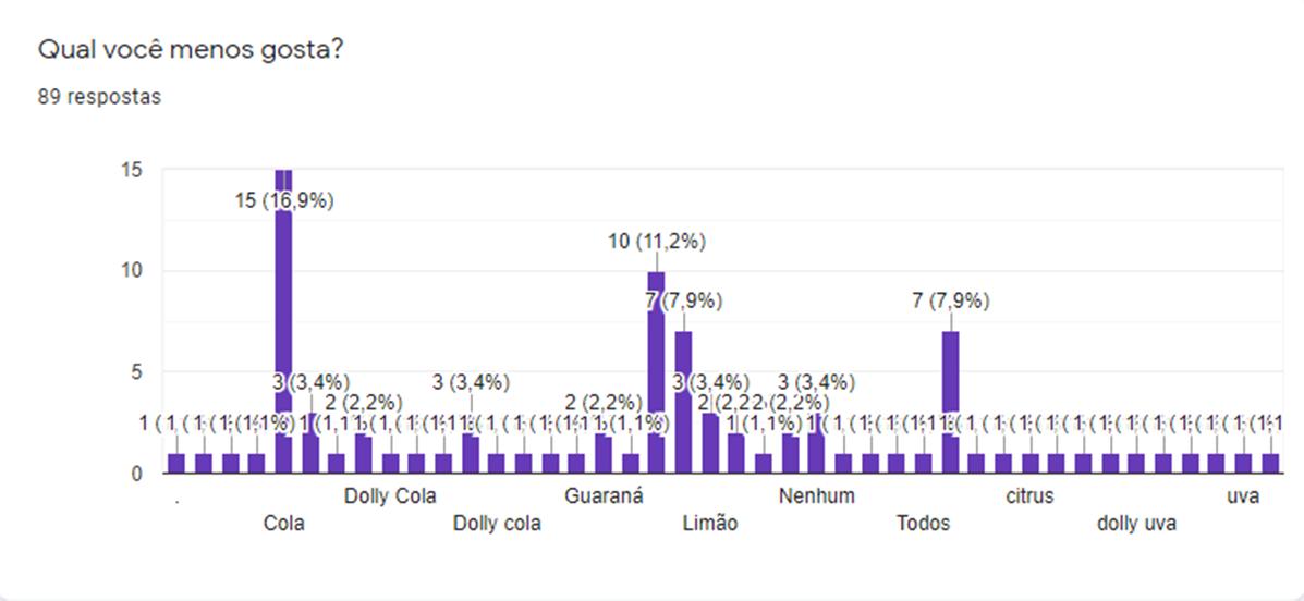 15 dos nossos entrevistados (16,9%) revelam que o sabor que menos gostam da marca é o Dolly Cola.
