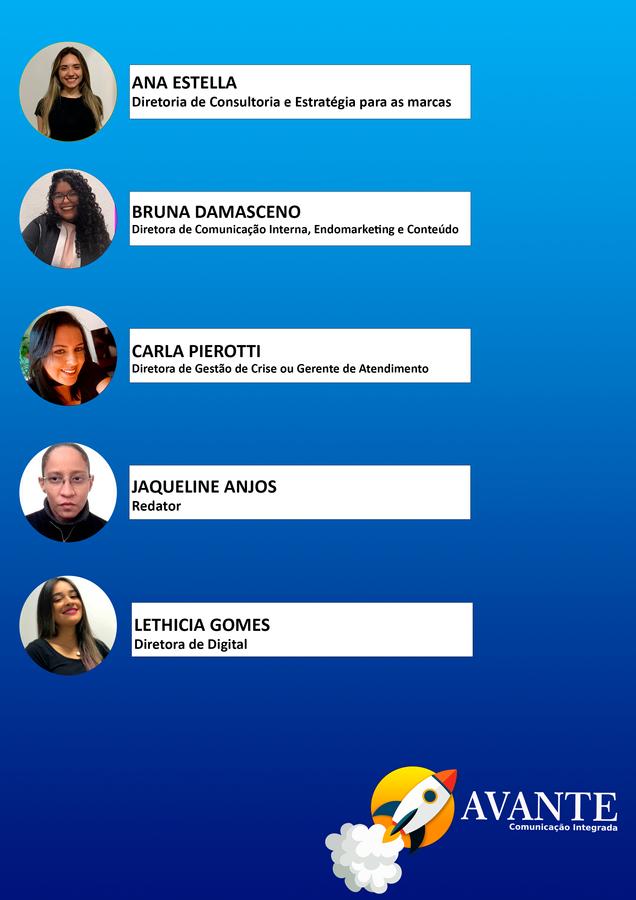A AVANTE é uma assessoria que surgiu durante a elaboração do Projeto Experimental para o curso de Relações Públicas 2020, na Universidade Cruzeiro do Sul. Os sócios-fundadores: Ana Estella Lima, Hesdras Carla Pierotti, Lethicia Gomes, juntos idealizaram o projeto a fim de ingressar no mercado profissional e atender as organizações. Bruna Costa Damasceno e Jaqueline Anjos Sousa integraram a equipe nos anos de 2021 e 2022 respectivamente.