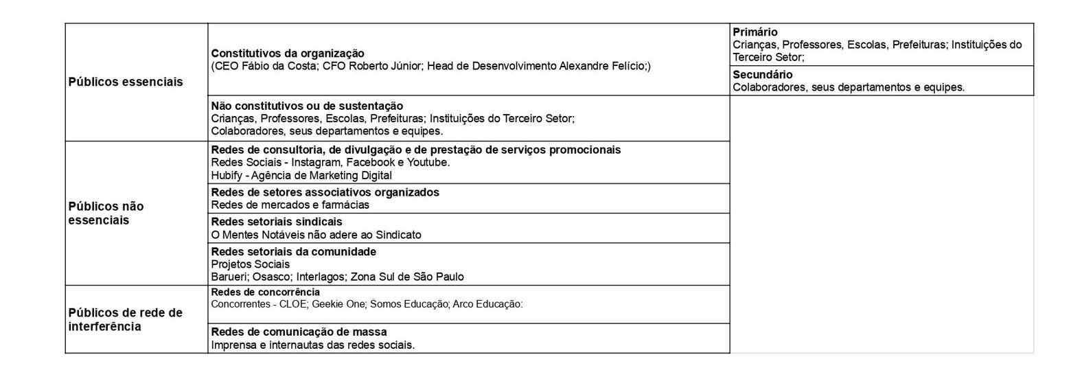 Antes de mudarem os termos, nós estávamos procurando uma segunda opção no ramo do 2° setor, mas não achamos uma empresa que encantasse a assessoria como a Mente Notáveis, por ser uma empresa que tem o propósito tão bonito que é a educação, então fazer o trabalho na Mente Notáveis era o nosso maior objetivo.