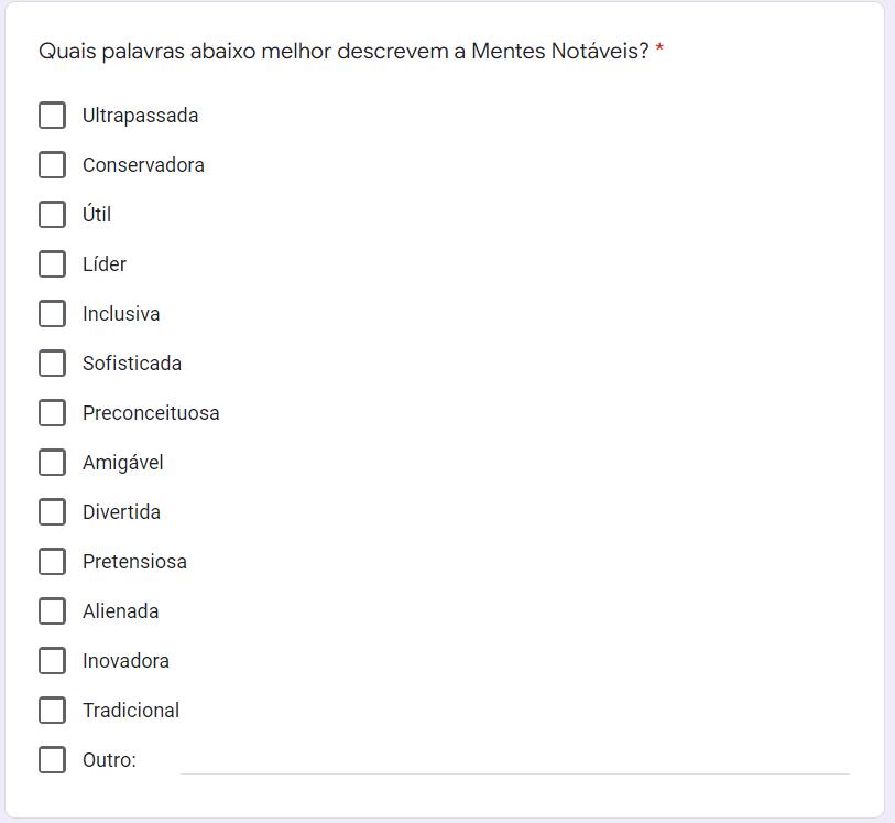 Ao entender qual o público-alvo, precisávamos entender qual o perfil dos consumidores e suas características e qual o sentimento do público perante a marca, além de pesquisa de benchmark para identificar em qual ranking a Mentes Notáveis se encontra em comparação aos concorrentes.