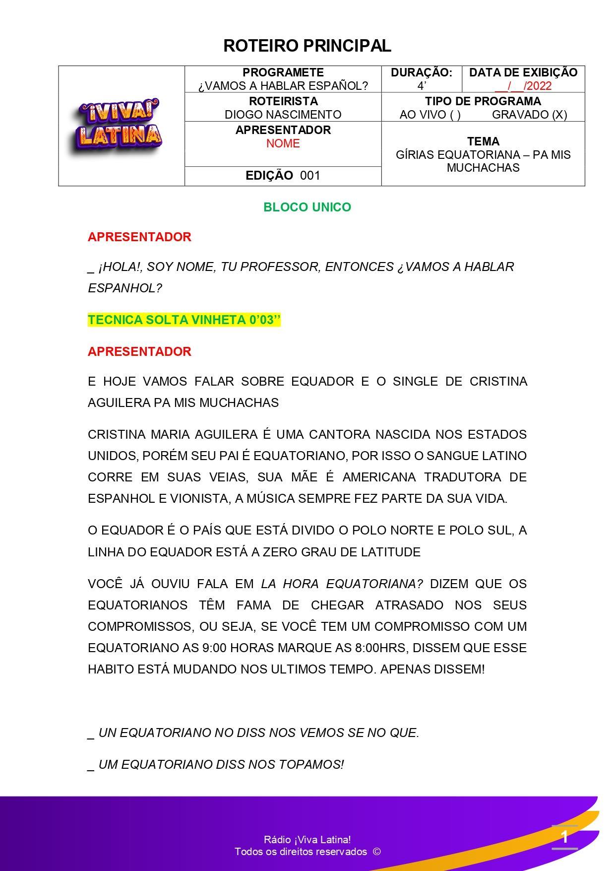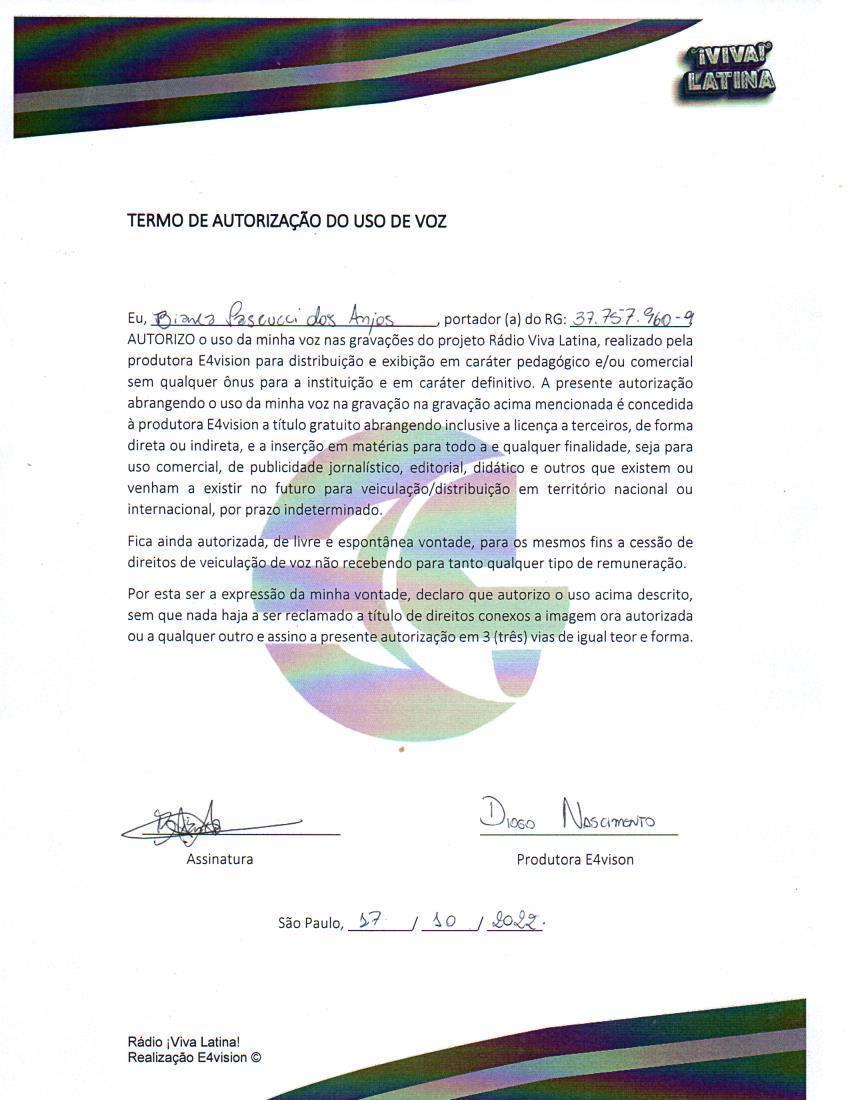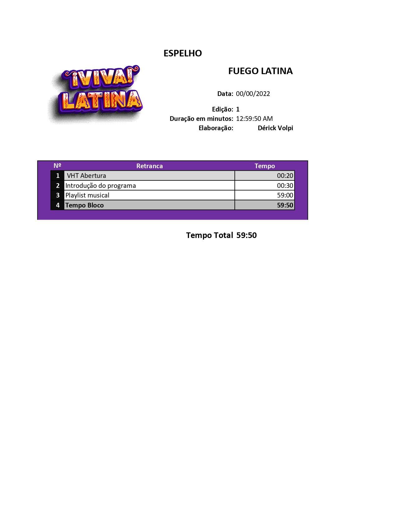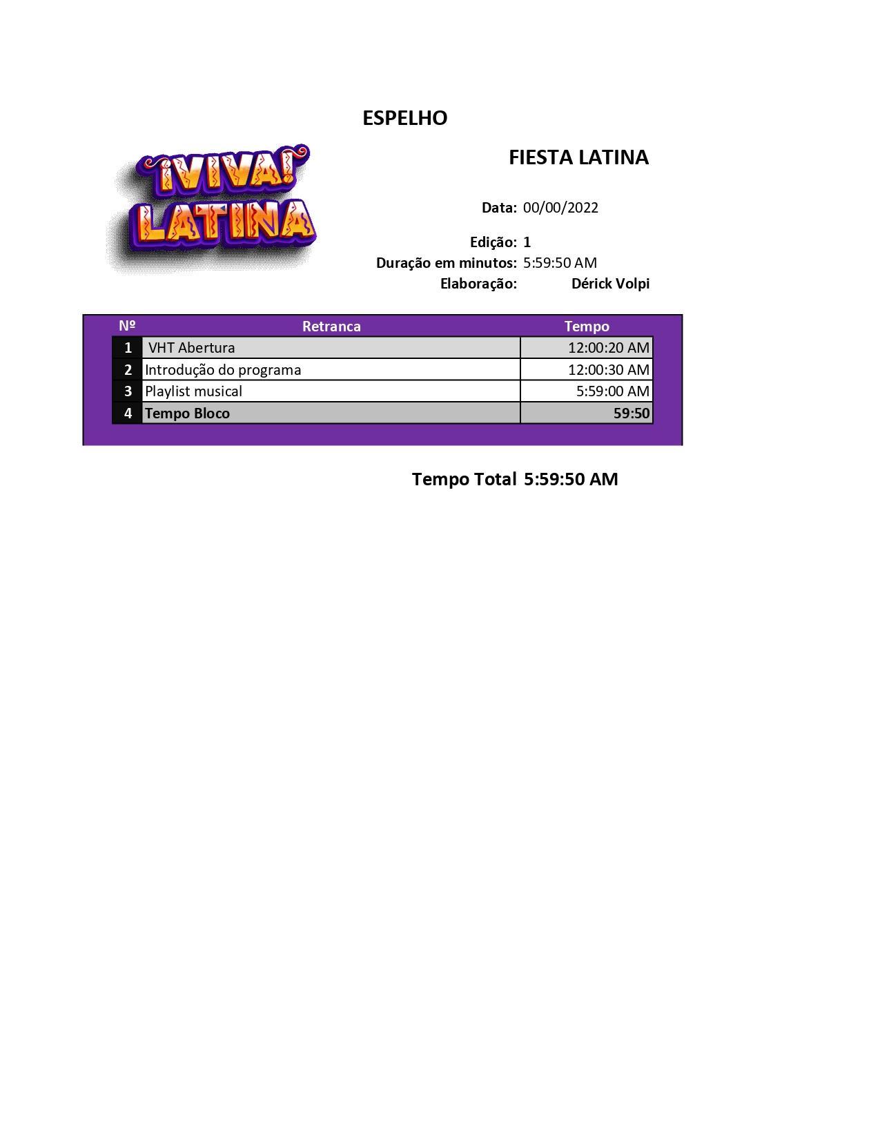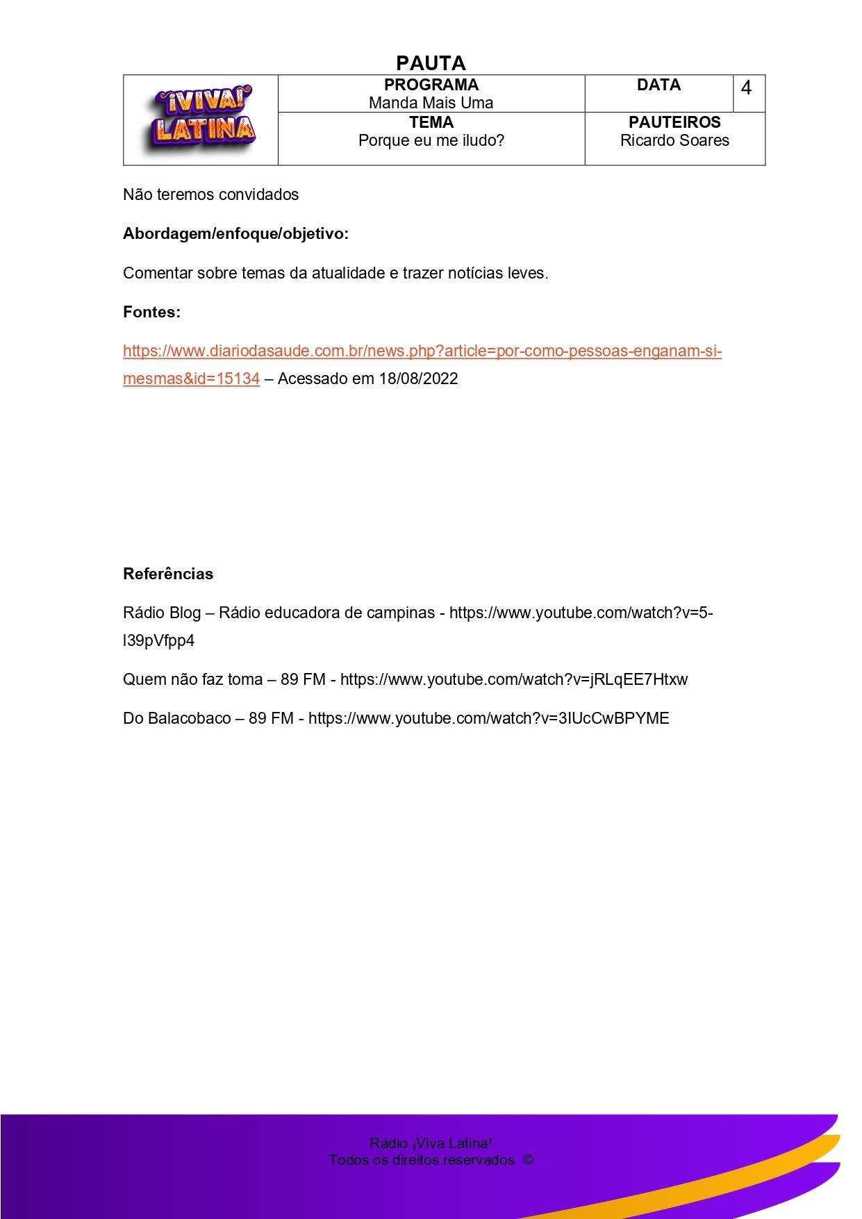 D.A.L.DO NASCIMENTO, J.R. DO NASCIMENTO, L.R. RIBEIRO, L. A. DA SILVA, P. V. R. SILQUEIRA, R. H. S. SILVA, T. G. SILVA, D. R. VOLPI. RÁDIO ¡ VIVA LATINA! Projeto Experimental – (Bacharel em Rádio, TV e Internet) Universidade Cruzeiro do Sul, São Paulo, 2022.
