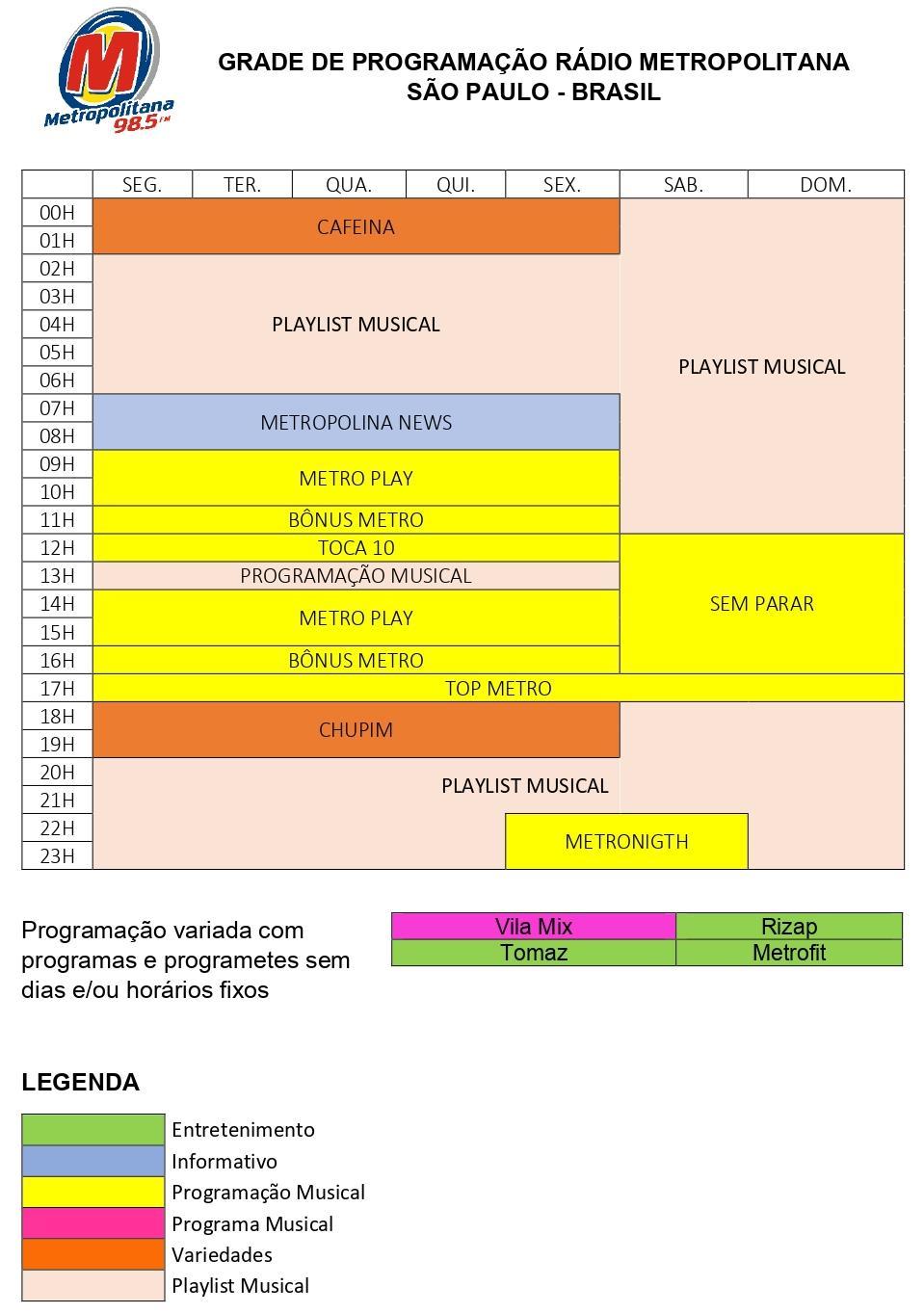 Foi realizada uma pesquisa para identificar as rádios presentes em São Paulo, englobando rádios no dial e também web rádios, com o objetivo de identificar os estilos das rádios do ambiente onde pretendíamos inserir a rádio Viva Latina. Neste estudo também selecionamos duas rádios paulistas e uma rádio da Argentina para uma análise mais específica de programação, com objetivo de identificar e comparar o consumo de rádio em São Paulo e na Argentina. Esta análise serviu de base para a criação da grade de programação da Rádio Viva Latina, trazendo elementos da cultura latina e nos destacando das rádios já existentes em São Paulo.