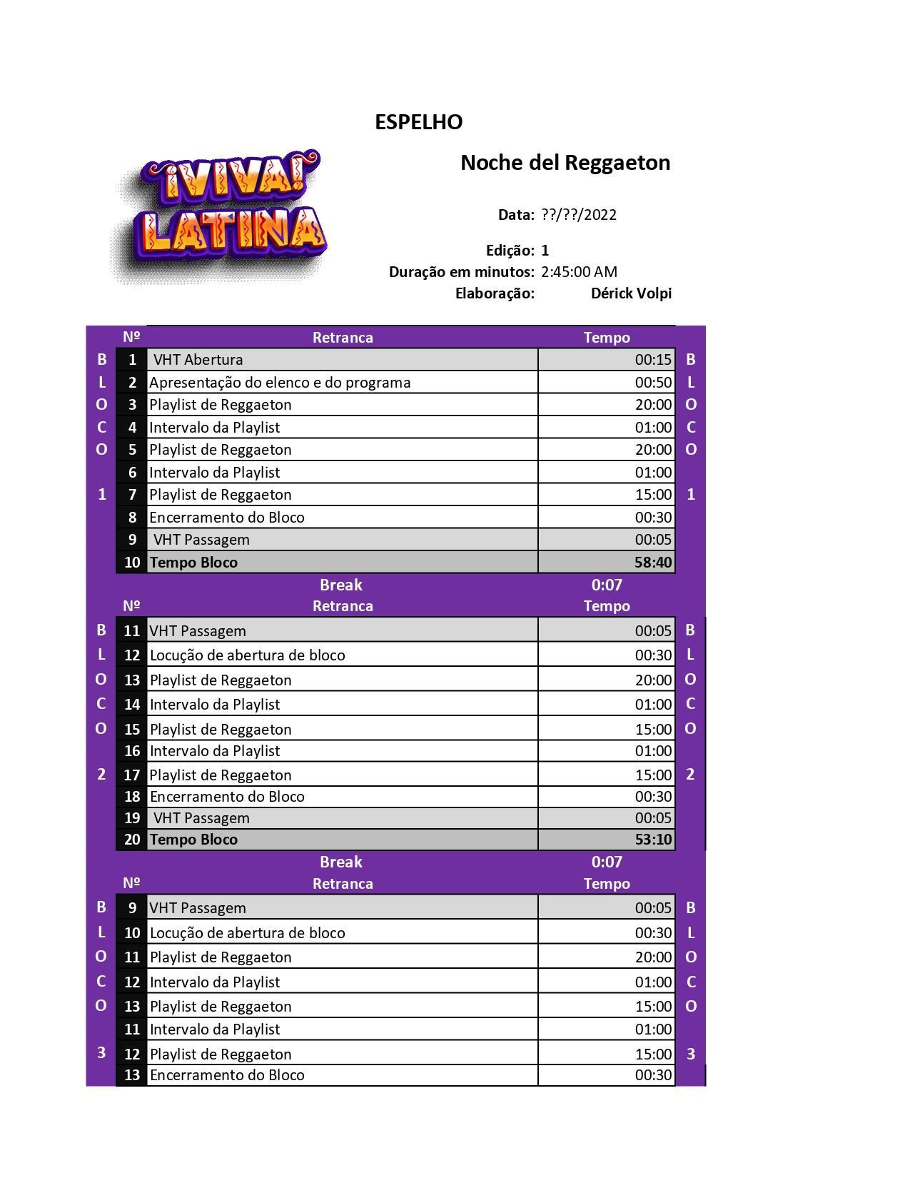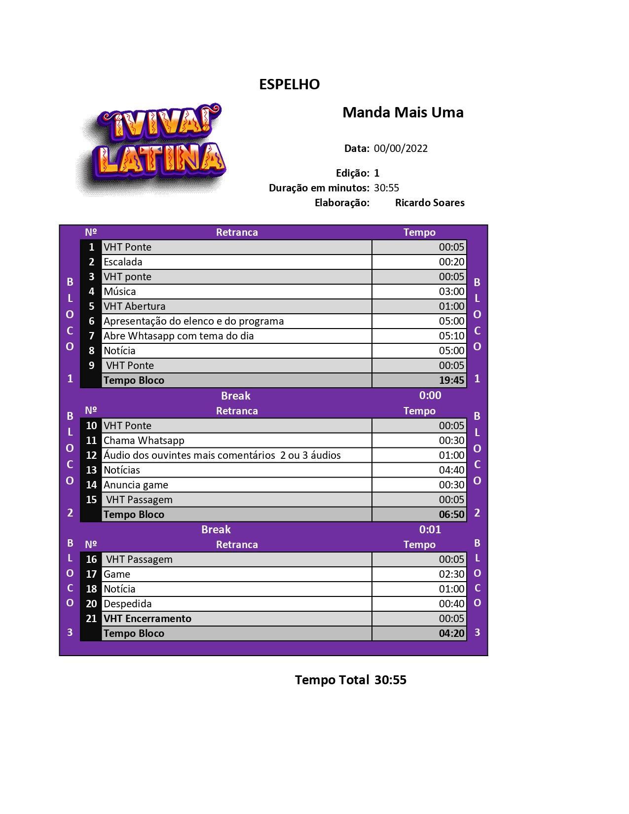 3. BÍBLIA DE PRODUÇÃO 71 3.1 EXPLICAÇÃO DO TÍTULO DO PROJETO 71 3.2 DESCRIÇÃO DO PROJETO 71 3.3 OBJETIVOS 72 3.3.1 OBJETIVO GERAL ...............................................................................72 3.3.2 OBJETIVOS ESPECÍFICOS 72 3.4 SOBRE A RÁDIO VIVA LATINA 72 3.4.1 GRADE DE PROGRAMAÇÃO 72 3.4.2 PROGRAMAS AO VIVO E GRAVADOS...............................................77 3.4.3 PROGRAMAÇÃO MUSICAIS 11 3.4.4 DESCRIÇÃO DOS PROGRAMAS........................................................11 3.4.5 DESCRIÇÃO DOS PROGRAMETES 26 3.5 REFERENCIAS ARTÍSTICAS.....................................................................33 3.6 REFERENCIAS ESPECIFICAS 34 3.7 INTERATIVIDADE.......................................................................................35 3.7.1 REDES SOCIAIS 35 3.8 APLICATIVO/SITE ......................................................................................37 3.9 IDENTIDADE SONORA 38 3.9.1 VINHETAS............................................................................................38 3.9.2 EFEITOS SONOROS 39 3.10 IDENTIDADE VISUAL ...............................................................................40 3.11 PÚBLICO ALVO 43 3.12 VEICULAÇÃO 45 3.13 COMERCIALIZAÇÃO (ANUNCIO) 46 3.14 JUSTIFICATIVA 48 3.15 DESENHO DE PRODUÇÃO 50 3.15.1 Desenho de produção Rádio 50 3.15.2 Desenho de Produção Programas 55 3.16 O CRONOGRAMADAS ATIVIDADES DESENVOLVIDAS 58