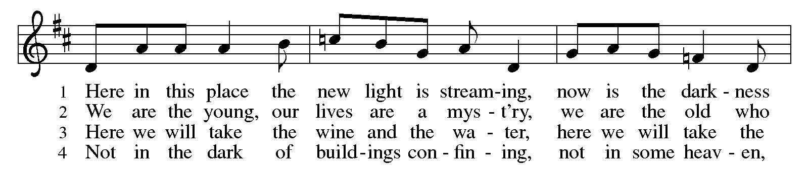 Let us go now to the banquet | to the feast of the universe | the table’s set and a place is waiting. | come, everyone, with your gifts to share. I will rise in the early morning; | the community’s waiting for me. | With a spring in my step I’m walking | with my friends and my family.