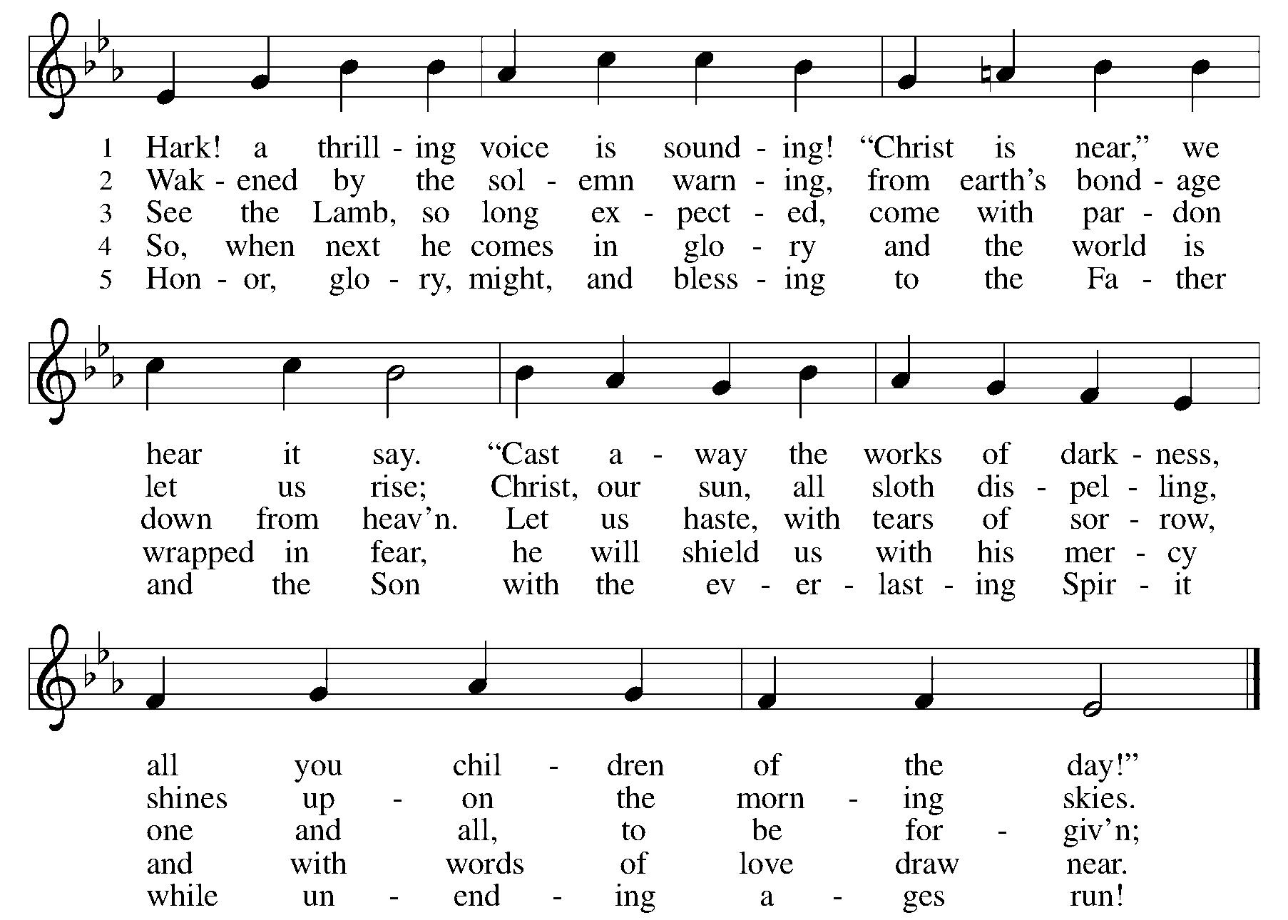 O Sun of justice, now draw near. Disperse the gloomy clouds of night, and death's dark shadow put to flight. Refrain