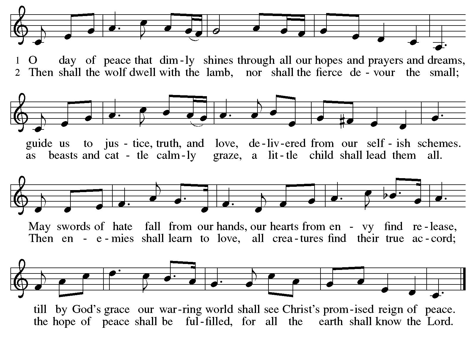 God of our longing, you know our deepest needs. By your Spirit, gather our prayers and join them with the prayers of all your children. In Jesus’ name we pray. Amen. Standing PEACE