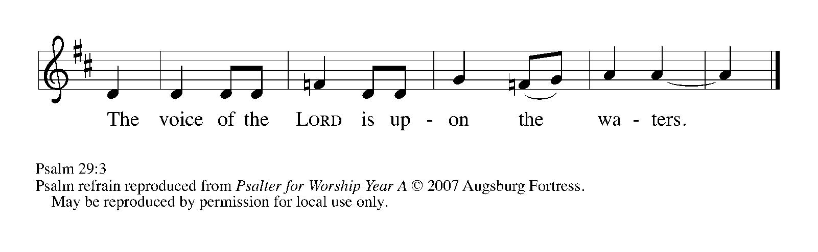 Ascribe to the | LORD, you gods, ascribe to the LORD glo- | ry and strength. Ascribe to the LORD the glory | due God’s name; worship the LORD in the beau- | ty of holiness. The voice of the LORD is upon the waters; the God of | glory thunders;
