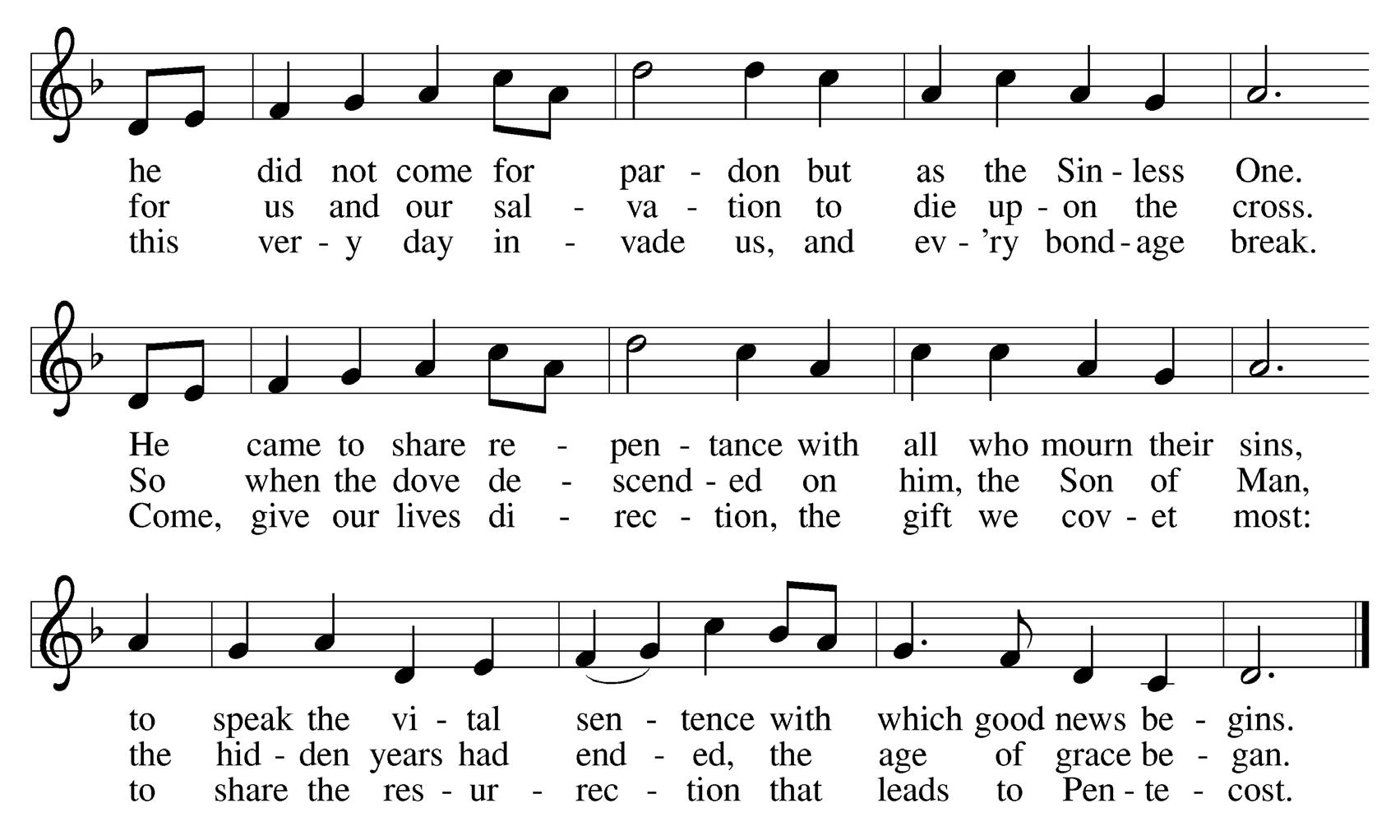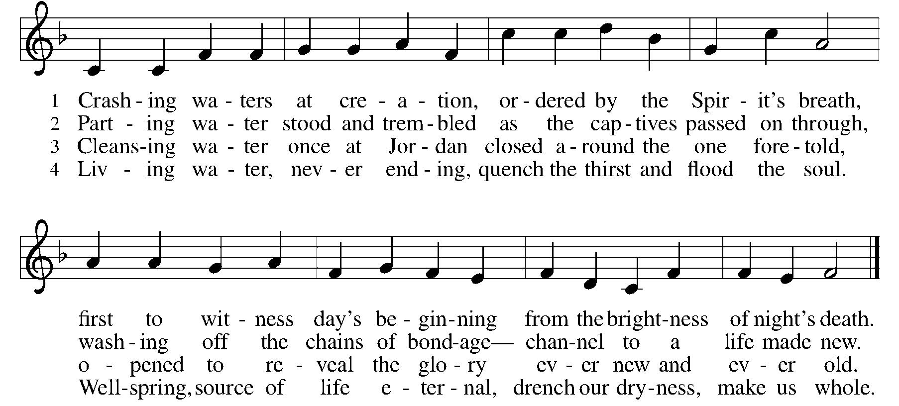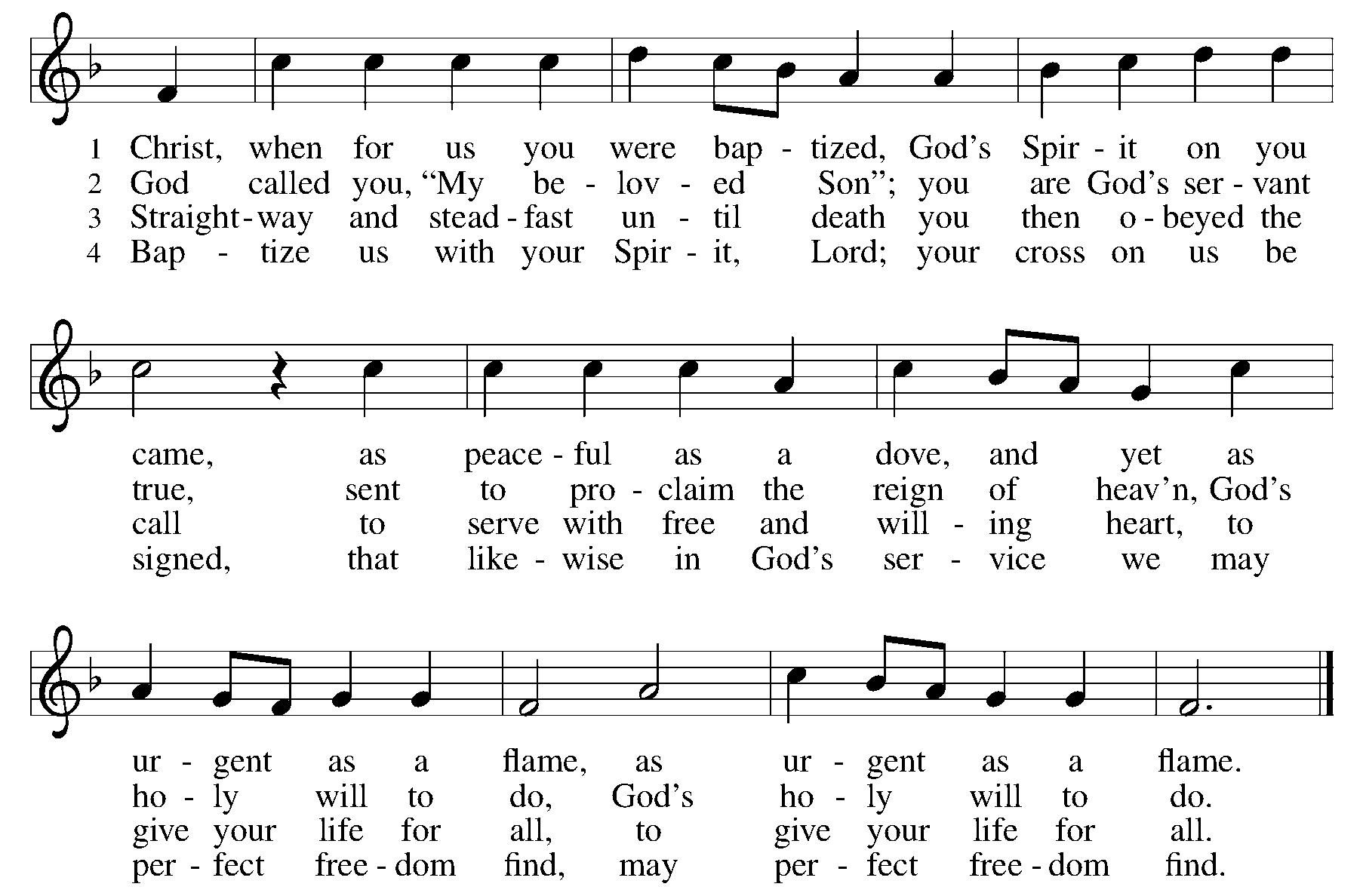 All who believe and are baptized shall see the Lord’s salvation; | baptized into the death of Christ, they are a new creation; | through Christ’s redemption they will stand | among the glorious heavenly band | of every tribe and nation. With one accord, O God, we pray, | grant us your Holy Spirit; | help us in our infirmity | through Jesus’ blood and merit; | grant us to grow in grace each day | by holy baptism, that we may | eternal life inherit.