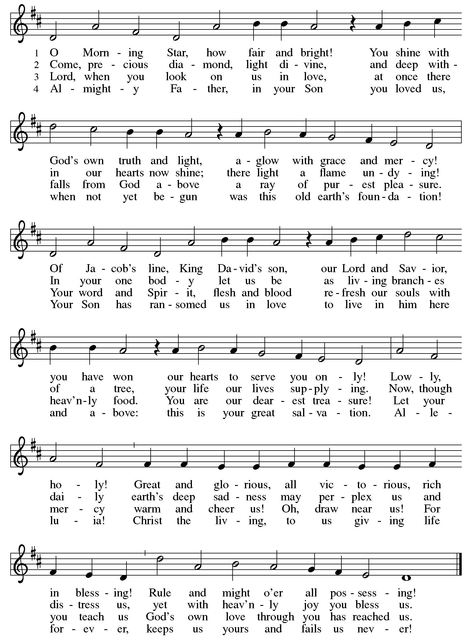 Holy Spirit gathers us in unity on the first day of the week, the day of Christ’s resurrection. Standing HYMN 308 O Morning Star, How Fair and Bright (Stanzas 1-4)