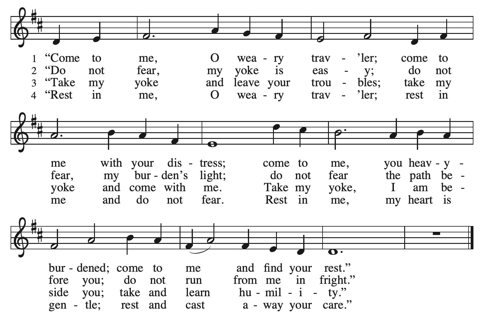 “Come to me, all you that are weary and are carrying heavy burdens, and I will give you rest. Take my yoke upon you, and learn from me; for I am gentle and humble in heart, and you will find rest for your souls. For my yoke is easy, and my burden is light.”