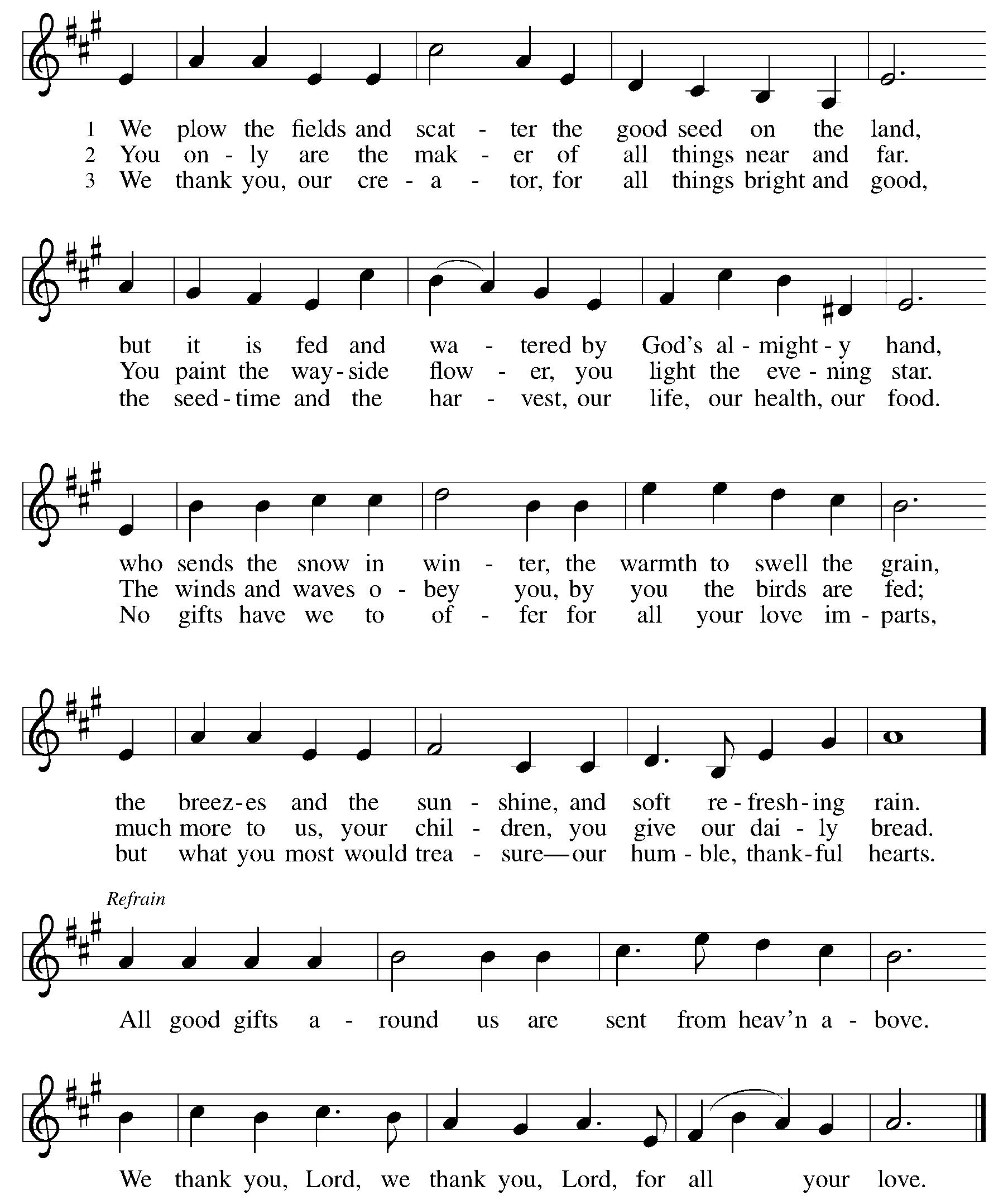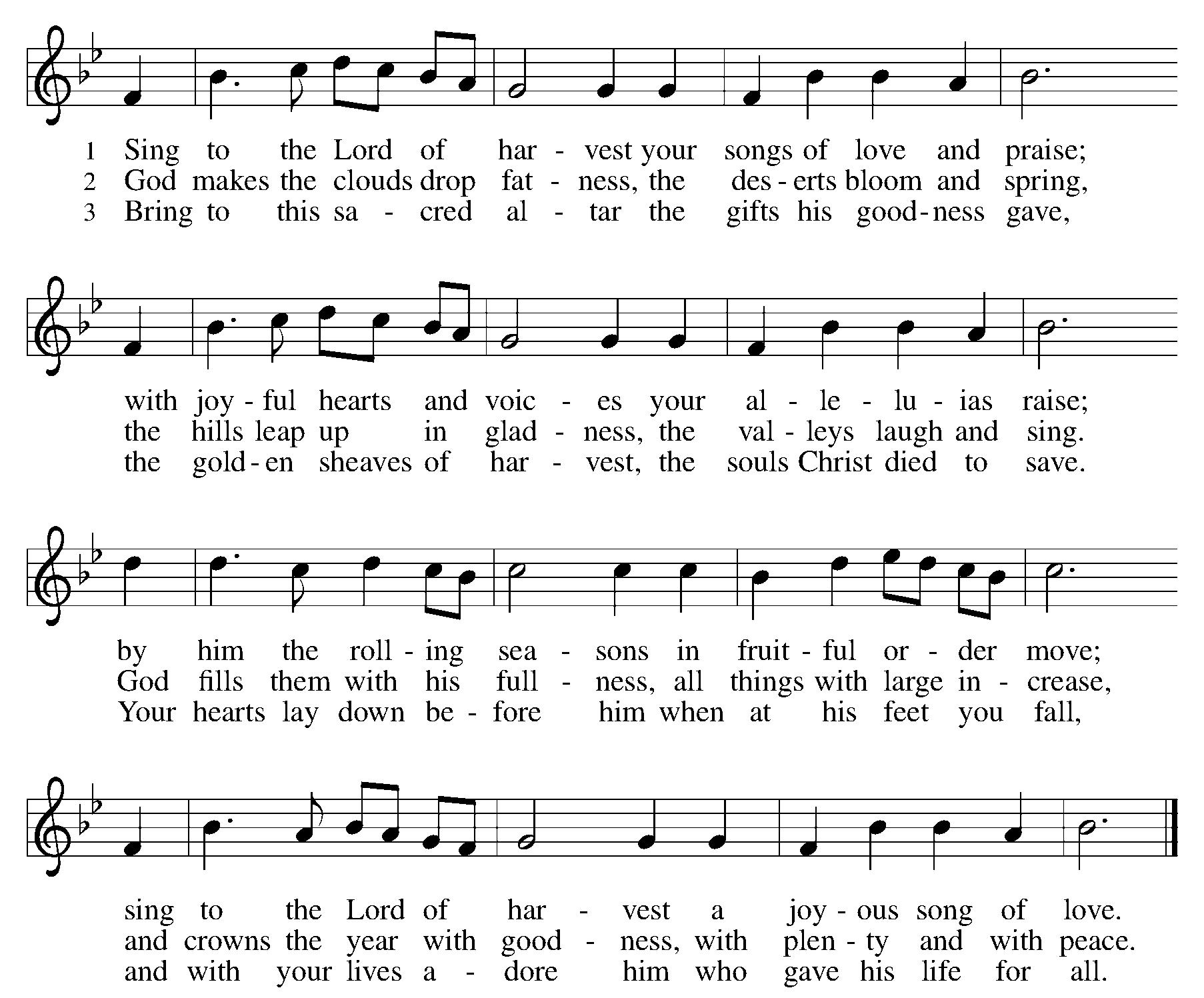 Come, ye thankful people, come; | raise the song of harvest home. | All be safely gathered in ere the winter storms begin. | God, our maker, doth provide | for our wants to be supplied. | Come to God's own temple, come, | raise the song of harvest home.
