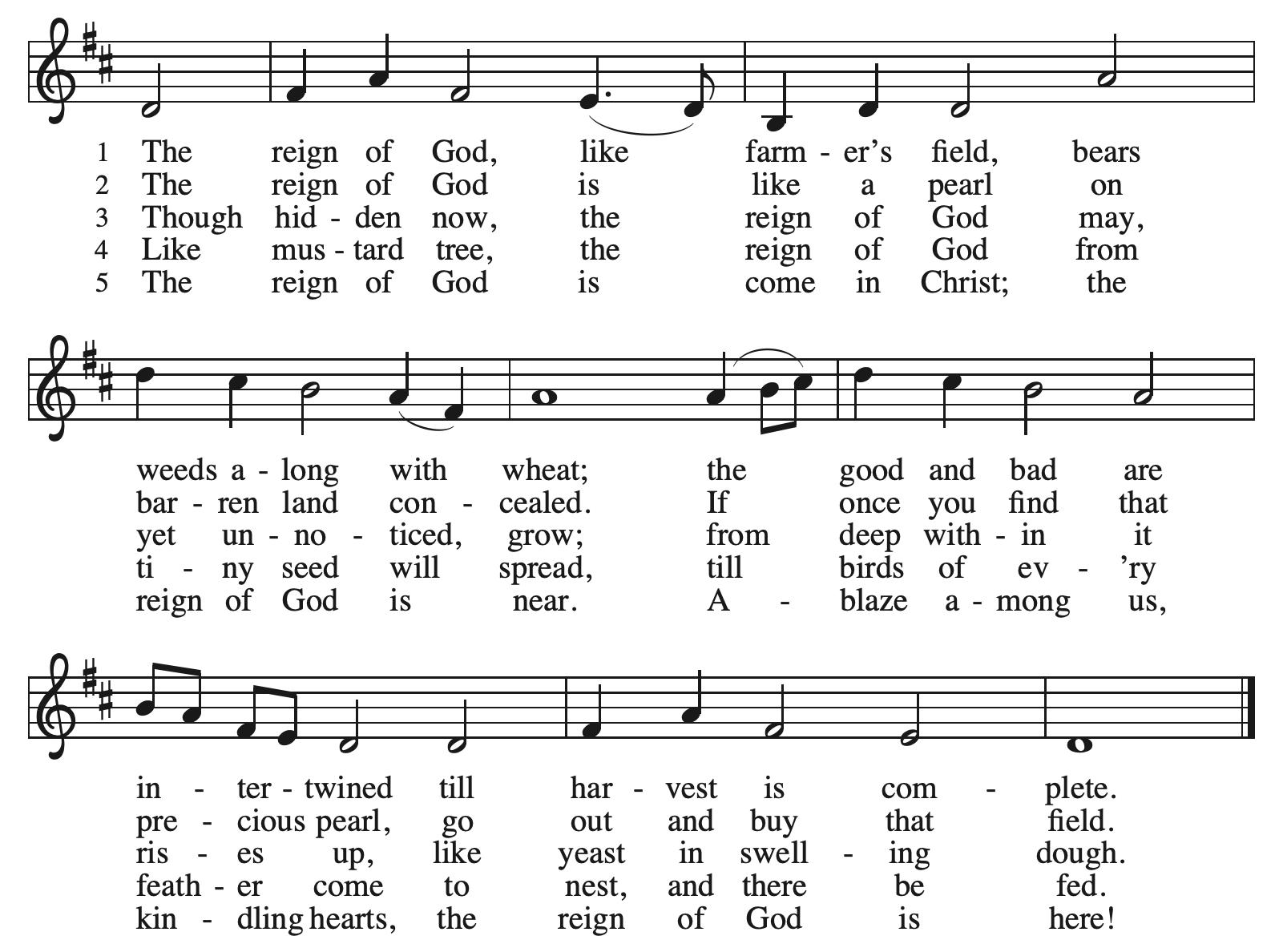 All the world is God's own field, | fruit unto his praise to yield; | wheat and tares together sown, | unto joy or sorrow grown. | First the blade, and then the ear, | then the full corn shall appear. | Lord of harvest, grant that we | wholesome grain and pure may be.
