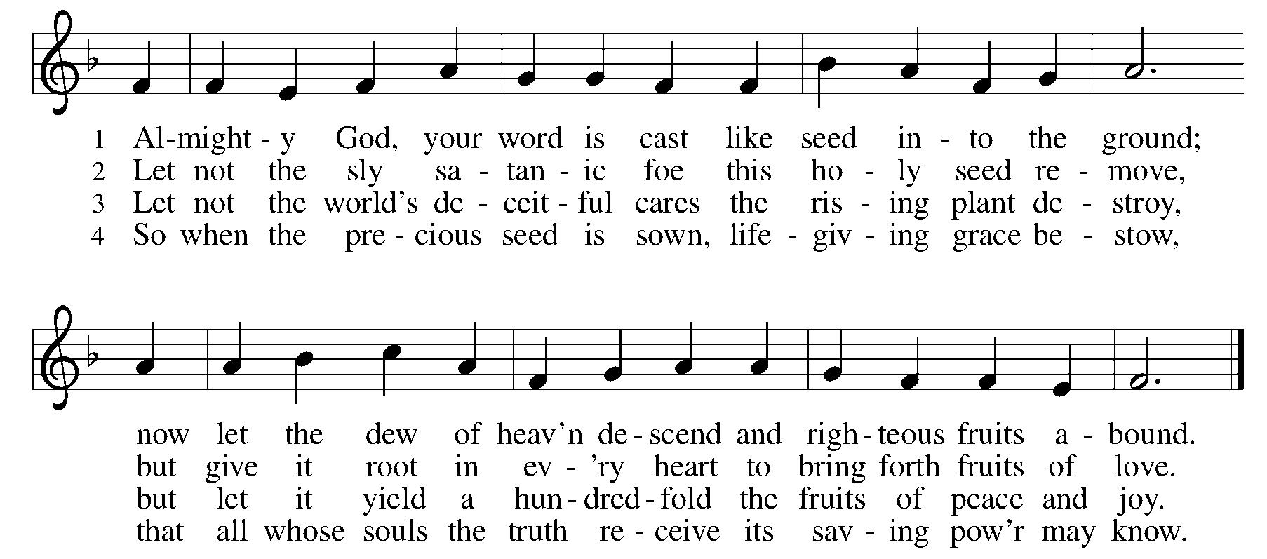 For the Lord our God shall come | and shall take his harvest home; | from his field shall in that day | all offenses purge away; | give his angels charge at last | in the fire the tares to cast, | but the fruitful ears to store | in his garner evermore.