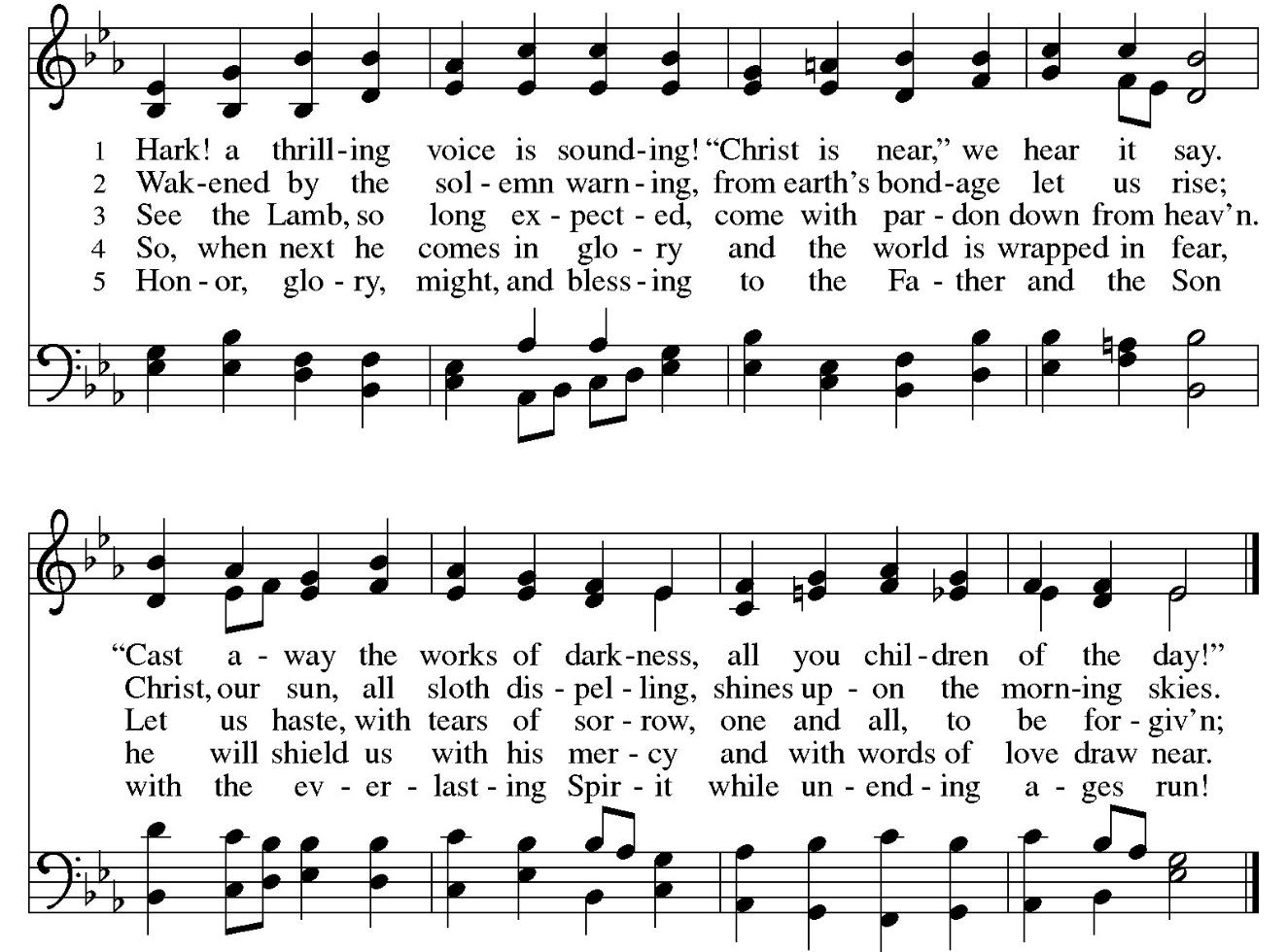Disperse the gloomy clouds of night, and death's dark shadow put to flight. Refrain