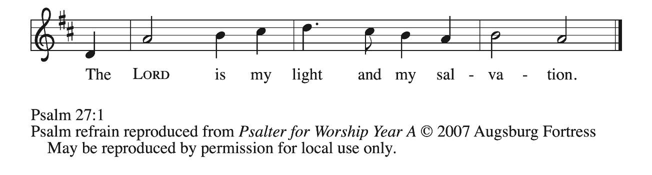 The Lord is my light and my salvation; the Lord is the strength of my life; whom shall I fear? One thing I ask of the Lord, one thing I seek; to dwell in the house of the Lord all the days of my life. Then shall my head be lifted up and I will sing praises unto the Lord.
