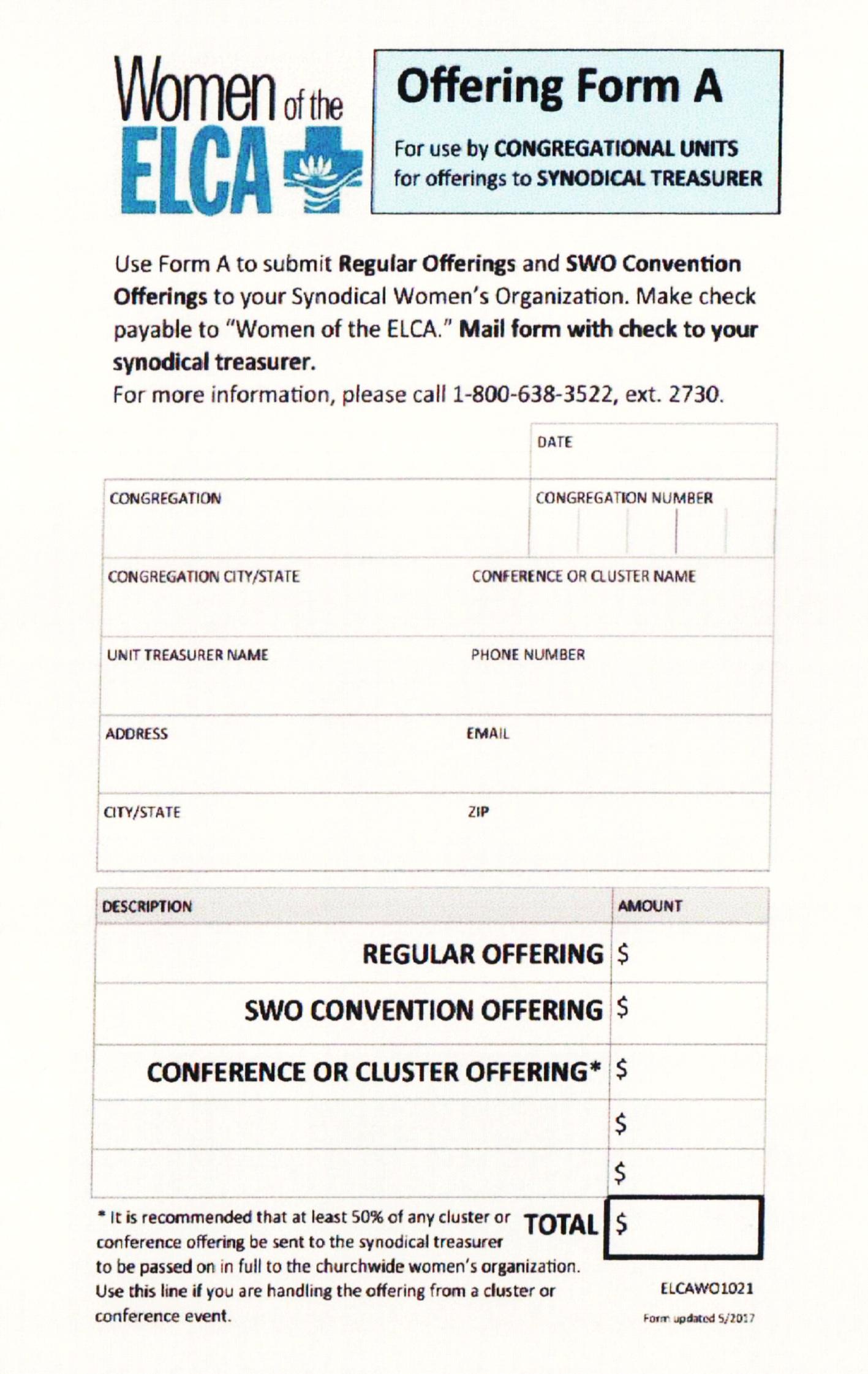 #1 - Send your regular offerings as your group meets monthly or quarterly (see form A) Checks payable to: SES WELCA (with Memo Line detail)