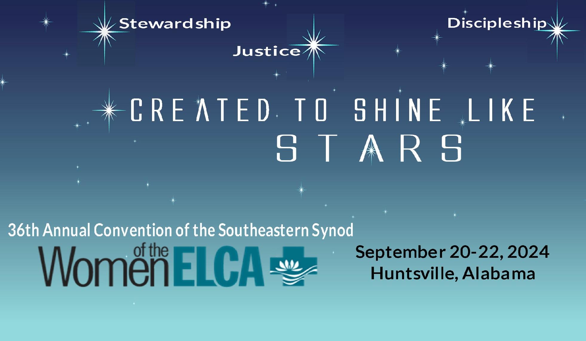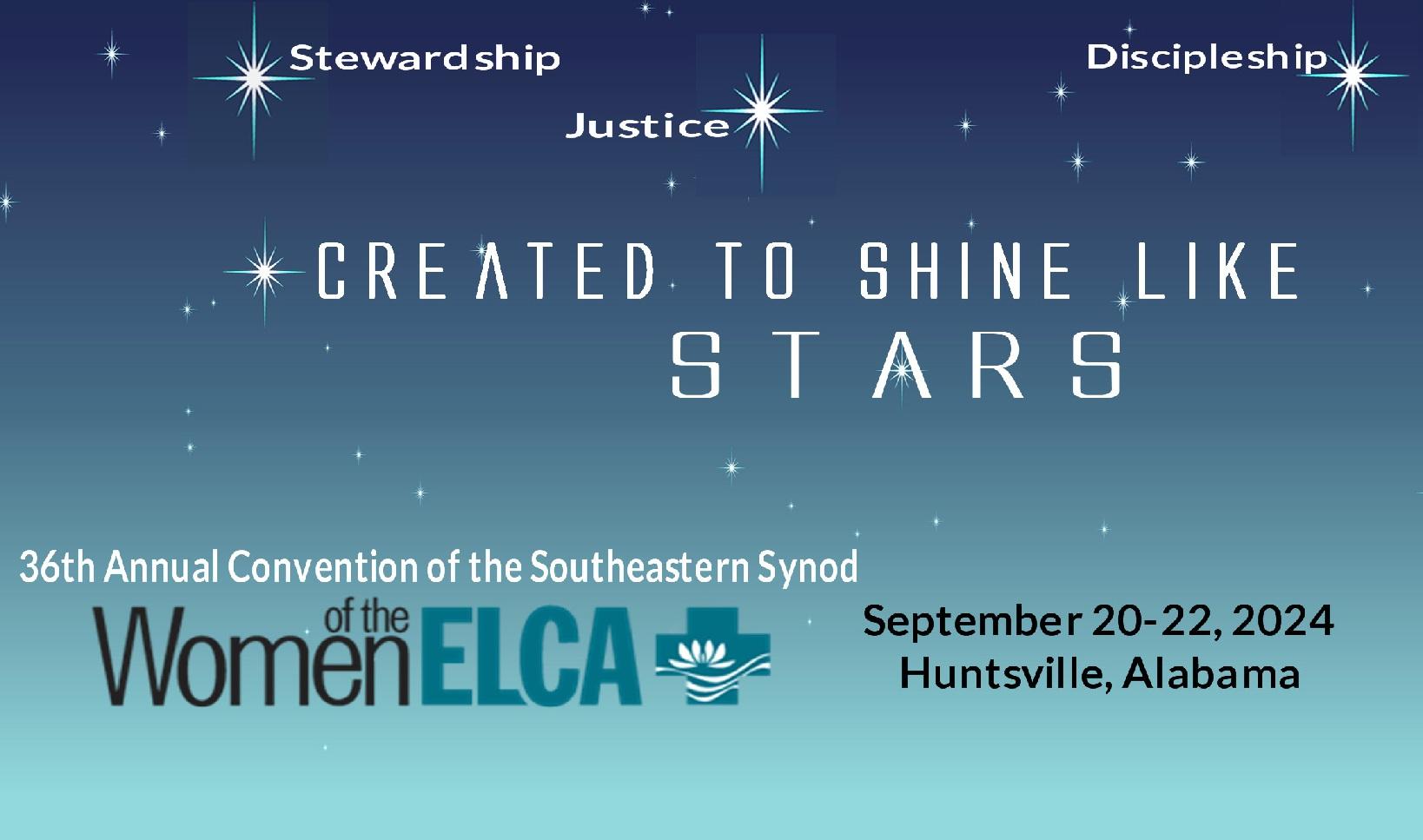 Your Southeastern Synod Women of the ELCA (WELCA) Board and our Host Cluster, 7-Diaspora, are excited to invite you to our 36th Annual Convention to be held at the Embassy Suites in Huntsville, Alabama, Friday, September 20, 2024, through Sunday, September 22, 2024. This year’s theme is “Created to Shine Like Stars” based on Daniel 12:3.