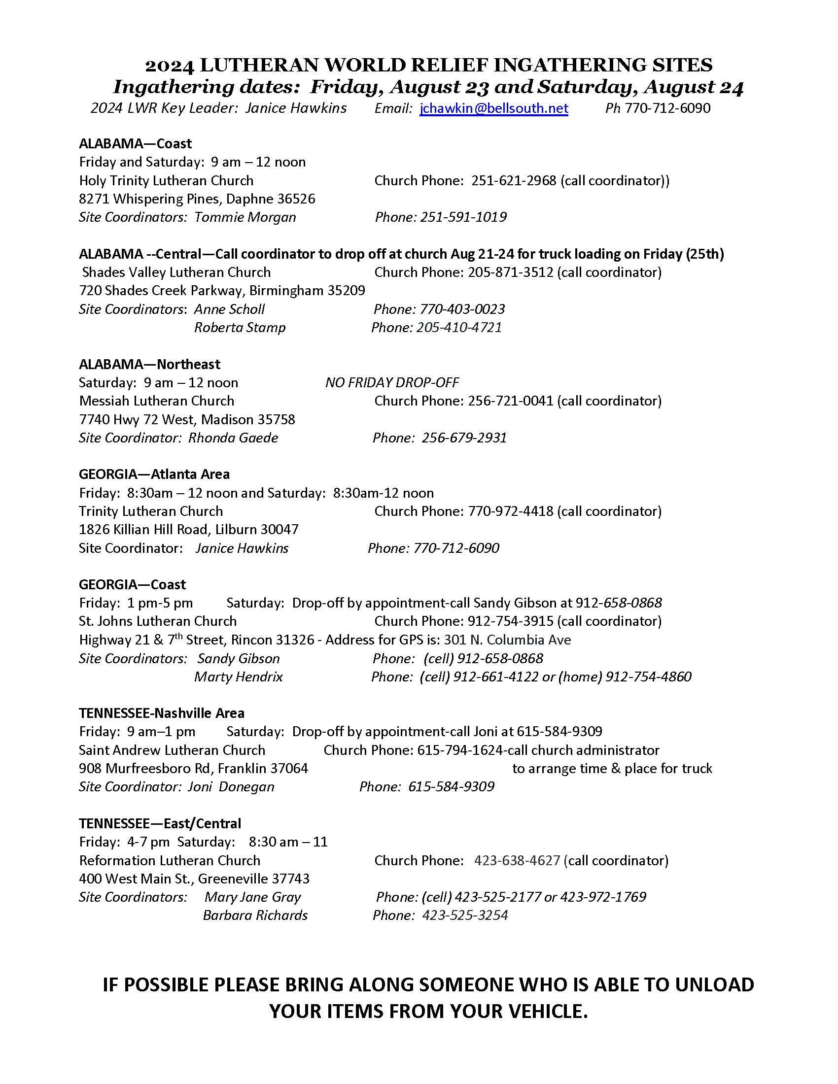 Janice Hawkins Lutheran World Relief Key Leader jchawkin@bellsouth.net
