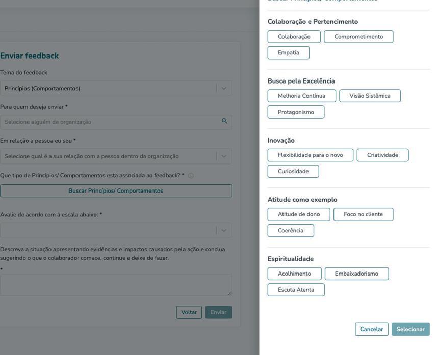 Caso o feedback seja sobre “Princípios – Comportamentos” (reveja nossos princípios na pág. 5), você terá a opção de selecionar os comportamentos que estão relacionados à mensagem de Feedback e depois definir a escala que melhor se adeque.